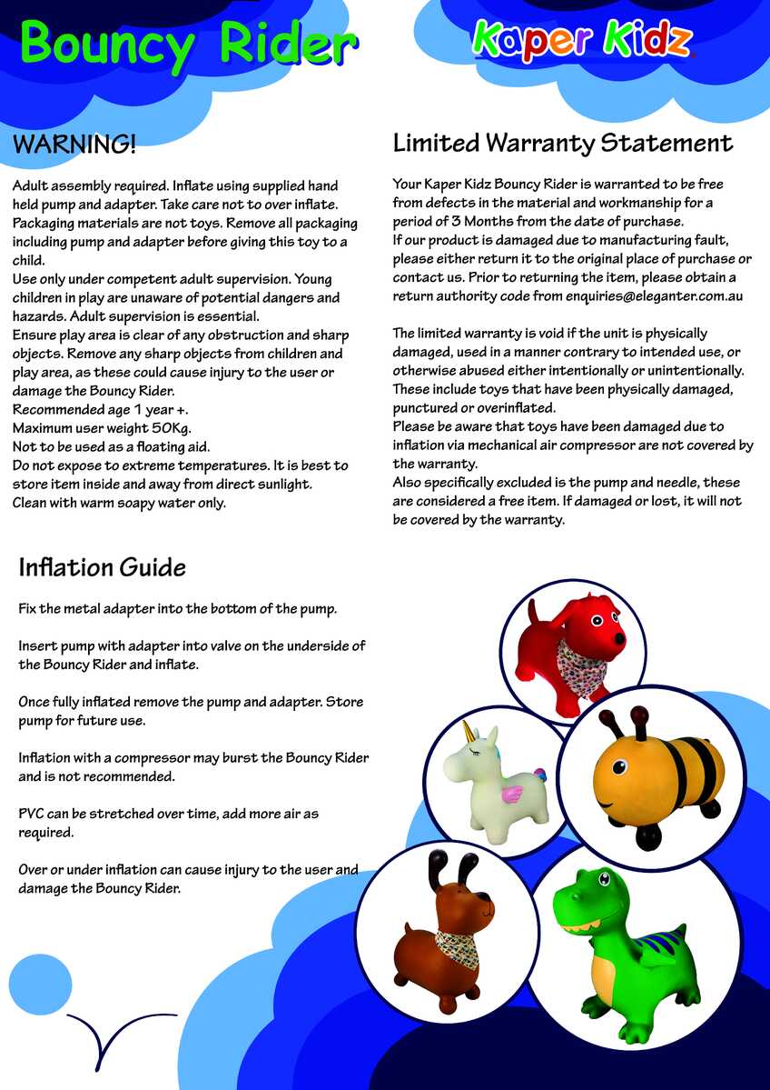 Introducing Bouncy Rider Zappy the T-Rex by Kaper Kidz, a thrilling inflatable ride-on that brings the mighty T-Rex to life. With its fierce demeanour and vibrant design, Zappy captures the essence of adventure and excitement. Created for durability and safety, this ride-on features a comfortable seat and secure grip handles for an exhilarating riding experience. Watch your child unleash their imagination as they embark on prehistoric escapades with Bouncy Rider Zappy the T-Rex is a roaring companion for endless fun. This toy come complete with a free hand pump and complies with EN71 & CPSIA, Phthalates and PAHs free.