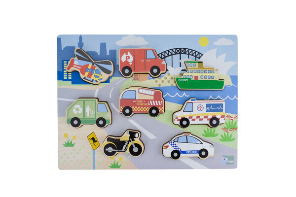 Get ready to cruise, chug, and zoom with the Wooden Chunky Aussie Transport Vehicle Puzzle from Koala Dreama playful celebration of Australia's most iconic vehicles! From the bustling post van to the brave fire truck, speedy police car, and the friendly ferry, each chunky wooden piece is designed for little hands to grasp, puzzle, and drive into imaginative adventures. But the fun doesn't stop there! Flip the puzzle board over to reveal a vibrant birds-eye view of Aussie roads and scenery perfect for using the vehicle pieces in pretend play. Whether it's an emergency rescue or a peaceful ferry ride, tiny drivers can take their vehicles on exciting journeys again and again. Crafted from quality wood and painted with non-toxic, child-safe paints, this Aussie-designed puzzle helps develop fine motor skills, shape recognition, language, and storytelling skills all while bringing the spirit of Australia's transport world to life!