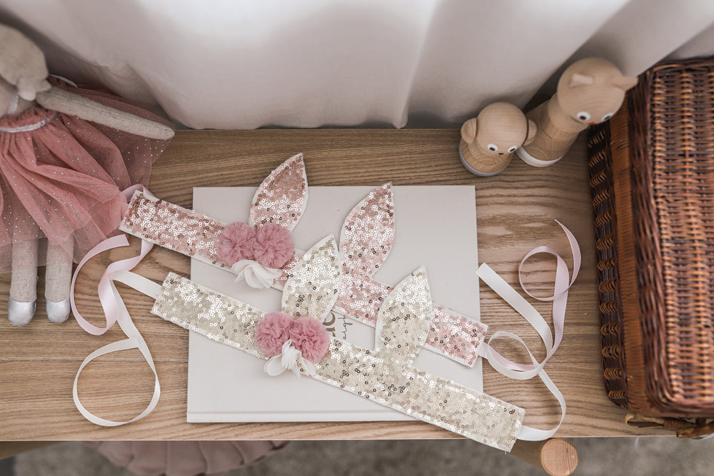 A sparkly sequin bunny gold adjustable crown for playtime. Bright rose gold sequin and felt with linen backing. Ribbon ties. Suitable 3yrs +