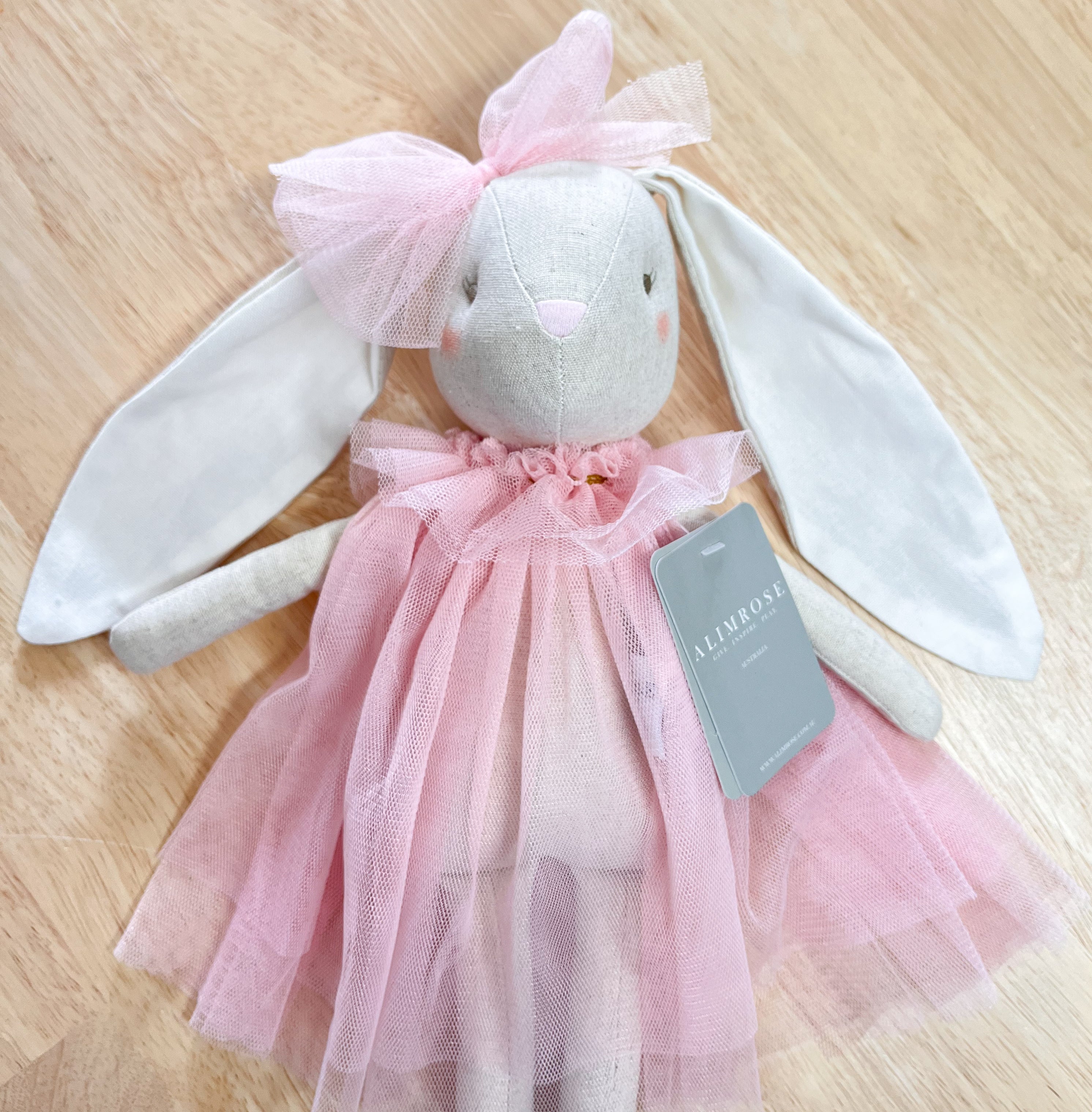 Baby Briar is a beautiful linen bunny dressed in the softest blush tulle. She will become your treasured keepsake. Suitable from 3 years.