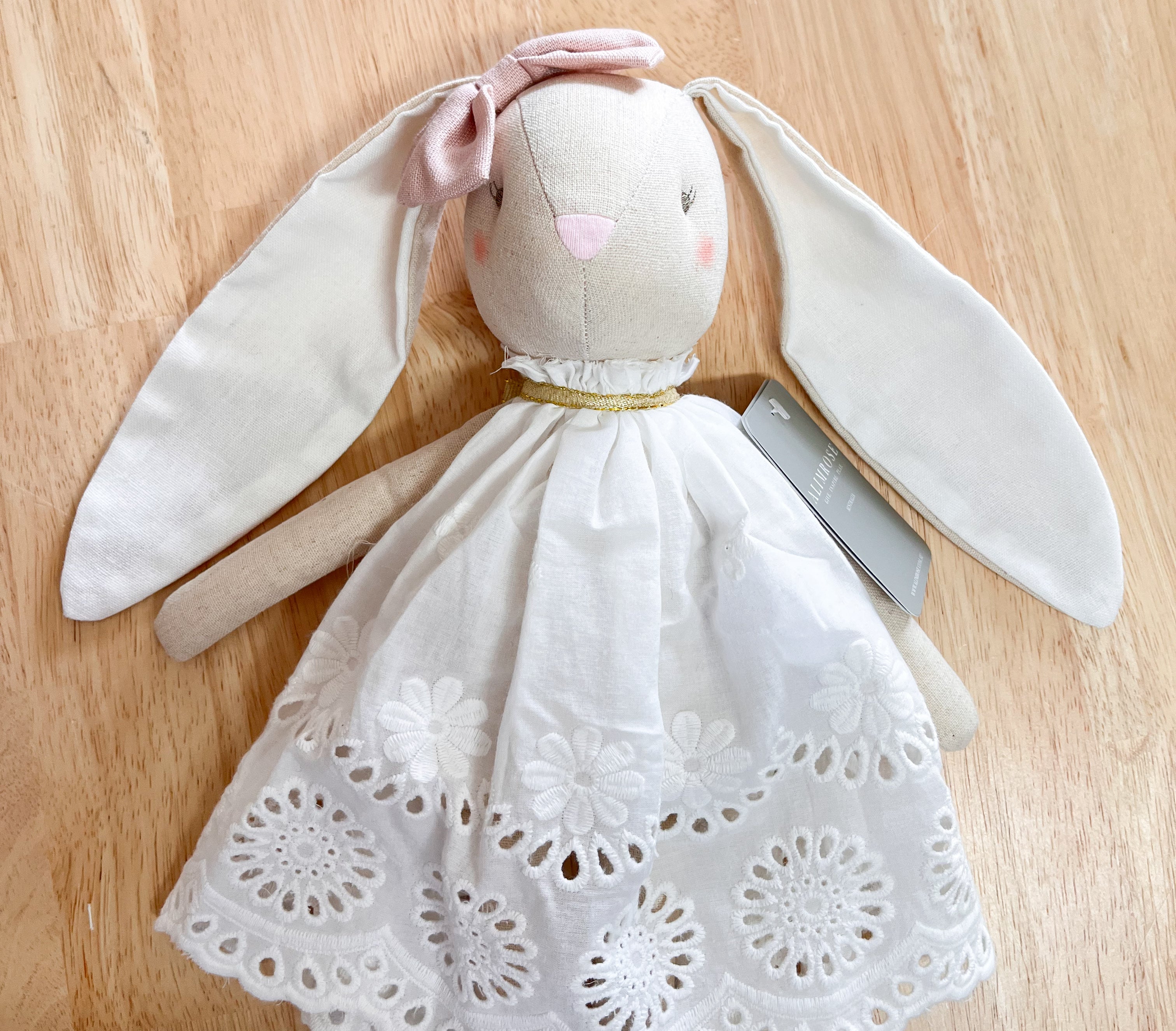 Mummy broderie bunny is a beautiful linen bunny dressed in her gorgeous ivory broderie dress. A great companion to our baby broderie bunny. She will become your treasured keepsake. Suitable from 3 years. Spot clean.