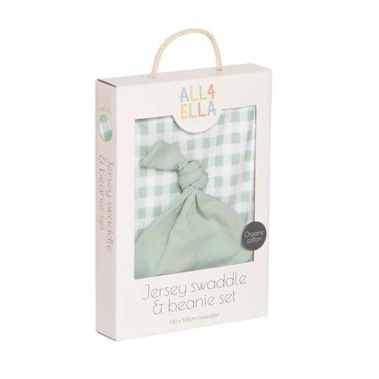 Our Jersey Swaddle & Beanie Set in Gingham Sage is the epitome of comfort and style for your little one.
