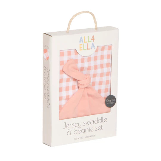 Our Jersey Swaddle & Beanie Set in Gingham Strawberry is the epitome of comfort and style for your little one.