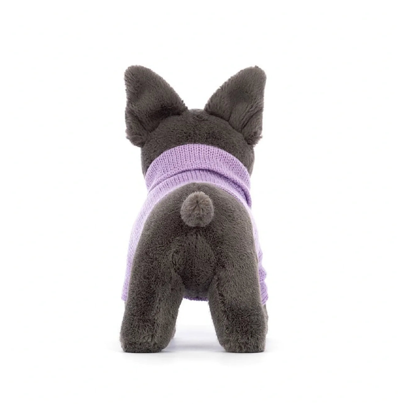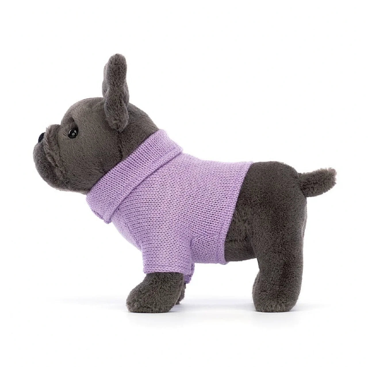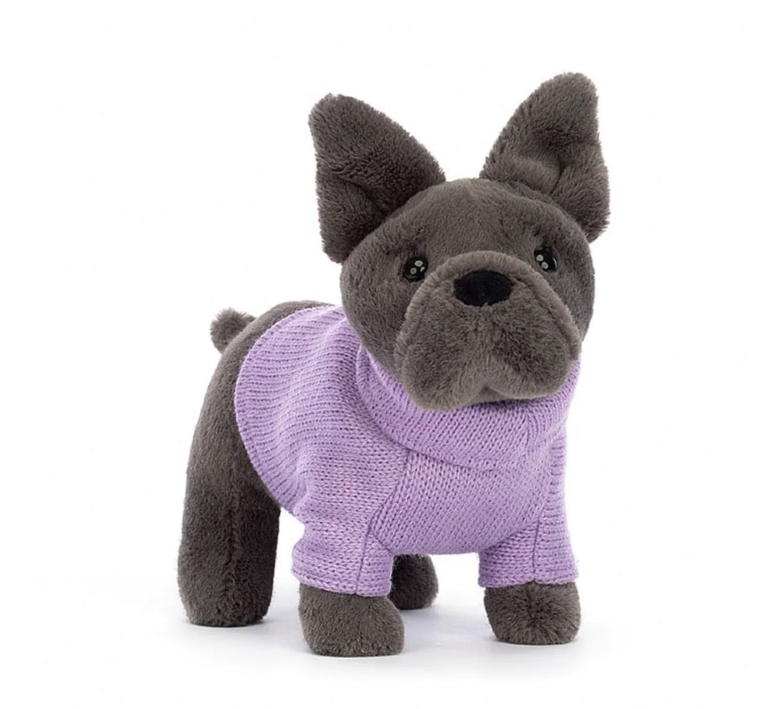 Bonjour! Sweater French Bulldog Purple is rocking the dog park in their lavender rollneck. This blue-grey pup has sweet stocky legs, a rumpled muzzle and a perky short tail, and if they want to run amok, the sweater comes off!