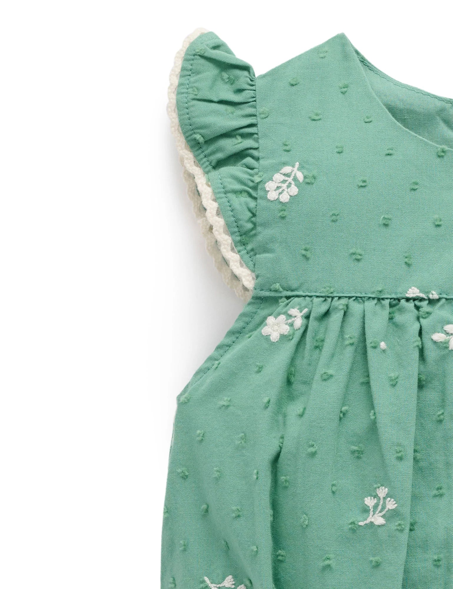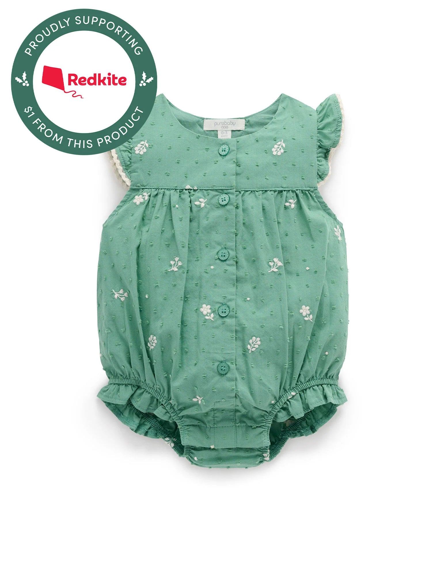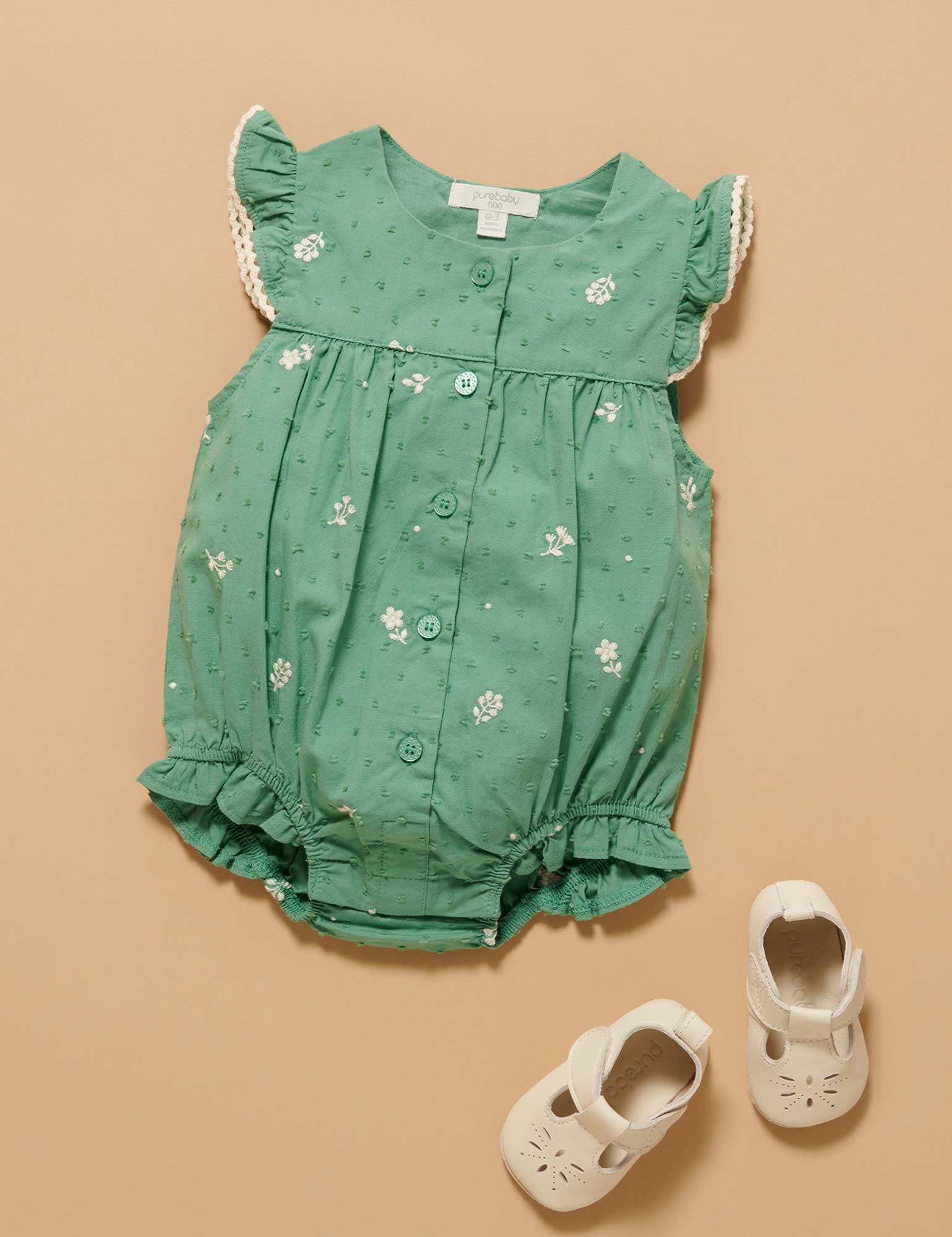 Our Festive Embroidered Bodysuit is pretty all-in-one style for the holiday season! Featuring ruffle details on the shoulders and legs, and a sweet all over floral embroidery. Made from the softest 100% Organic Cotton hailspot for a lightweight and breathable style.