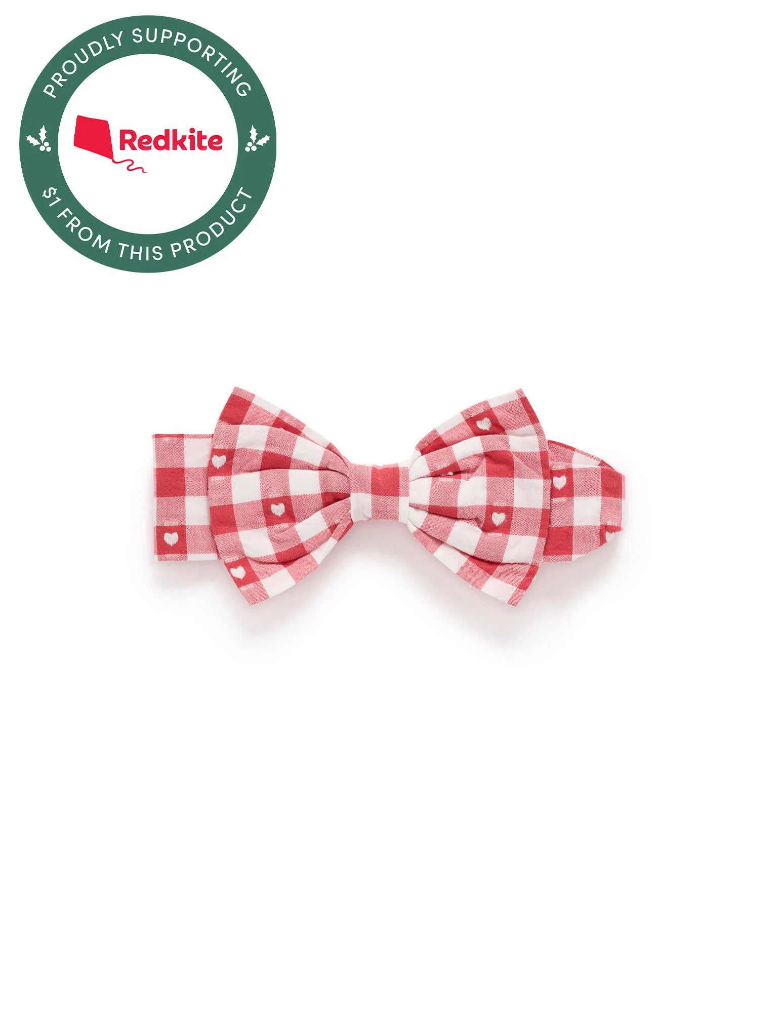 Our Heart Gingham Bow Headband makes the sweetest festive accessory to add to your little ones outfit. Featuring a big bow on an elasticised strap with a velcro closure. Made from soft 100% Organic Cotton in an all over gingham pattern with little hearts.