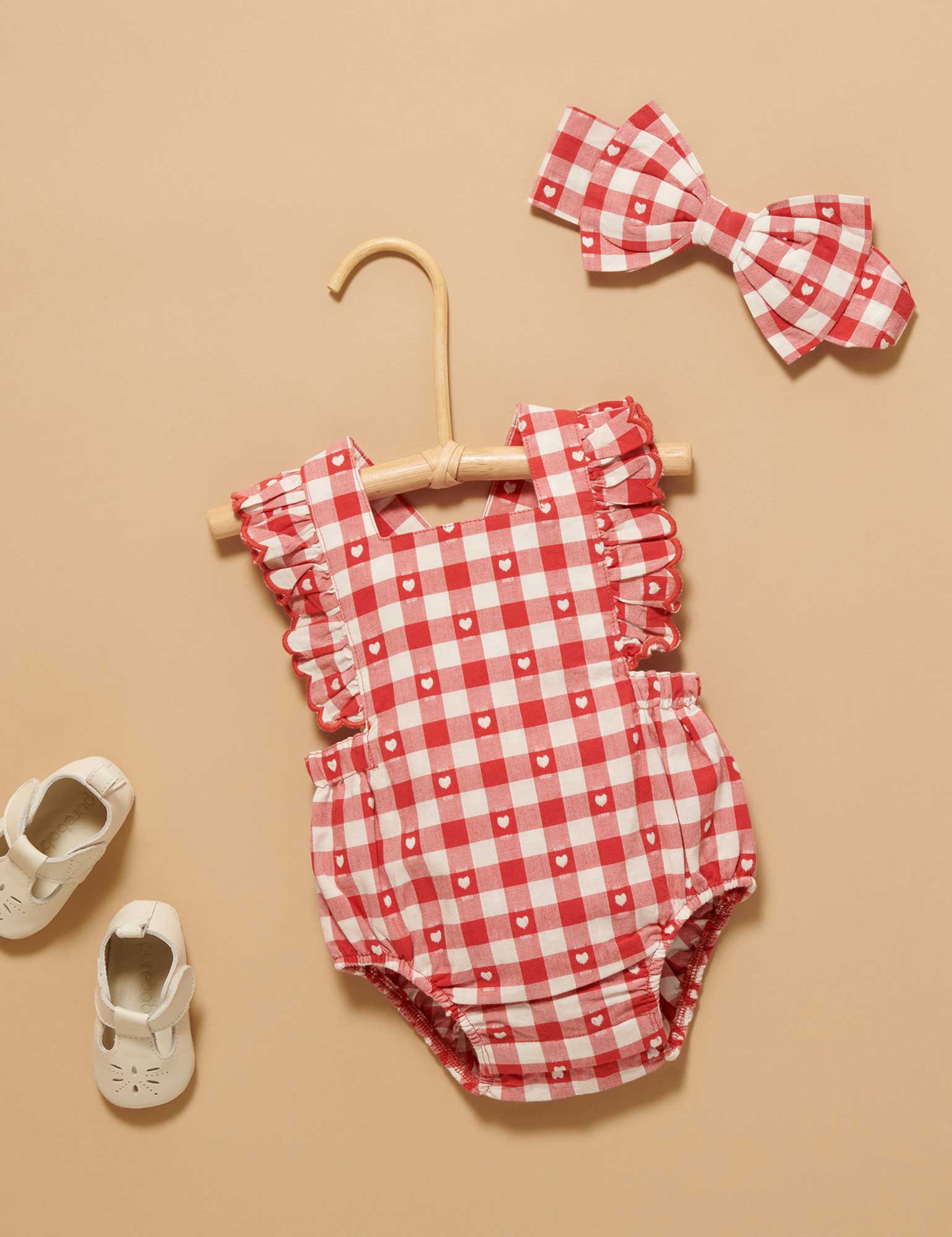 Our Gingham Overall Bodysuit is a pretty all-in-one style for those warm summer days! Featuring a sweet ruffle detail at the shoulders and an all over gingham pattern with little hearts. Designed with adjustable cross over straps, with gathers around the waist and legs for a comfy fit. Made from our organic cotton linen blend for a soft and breathable outfit. Pair with our matching Heart Gingham Bow Headband for a sweet look.