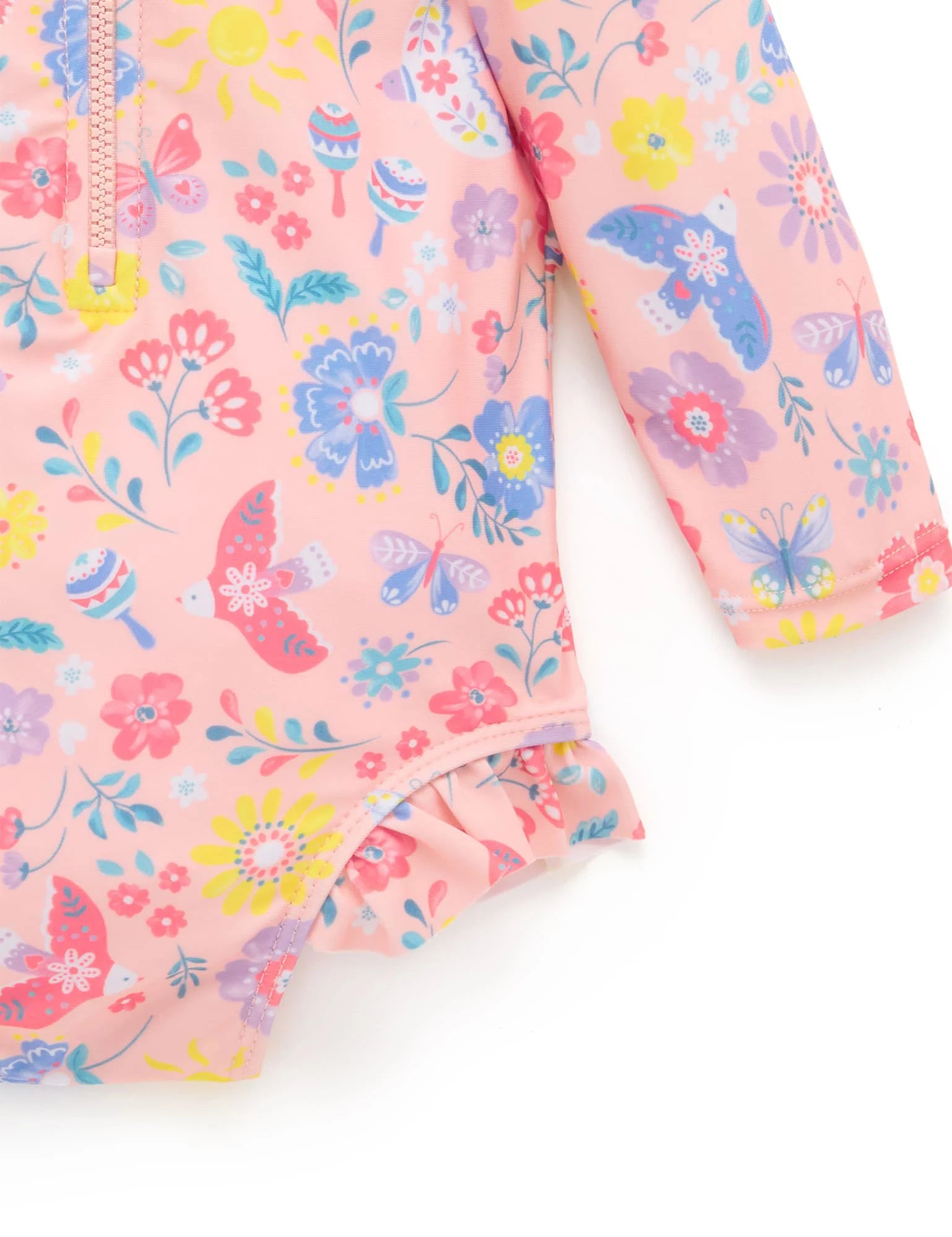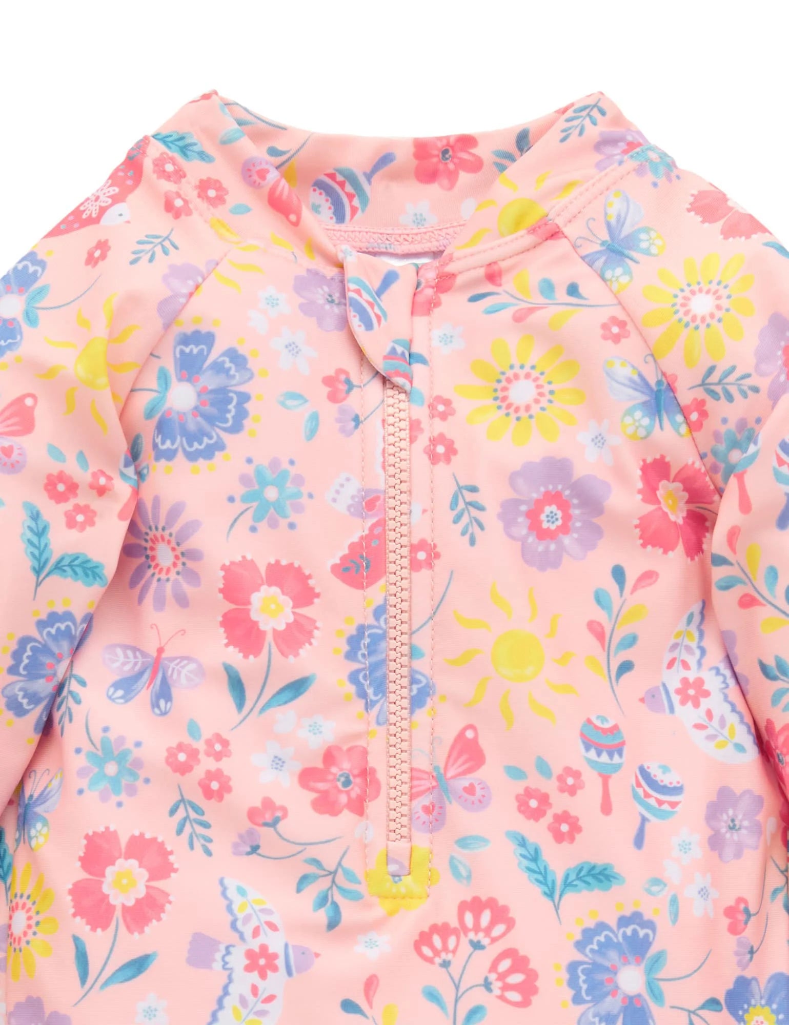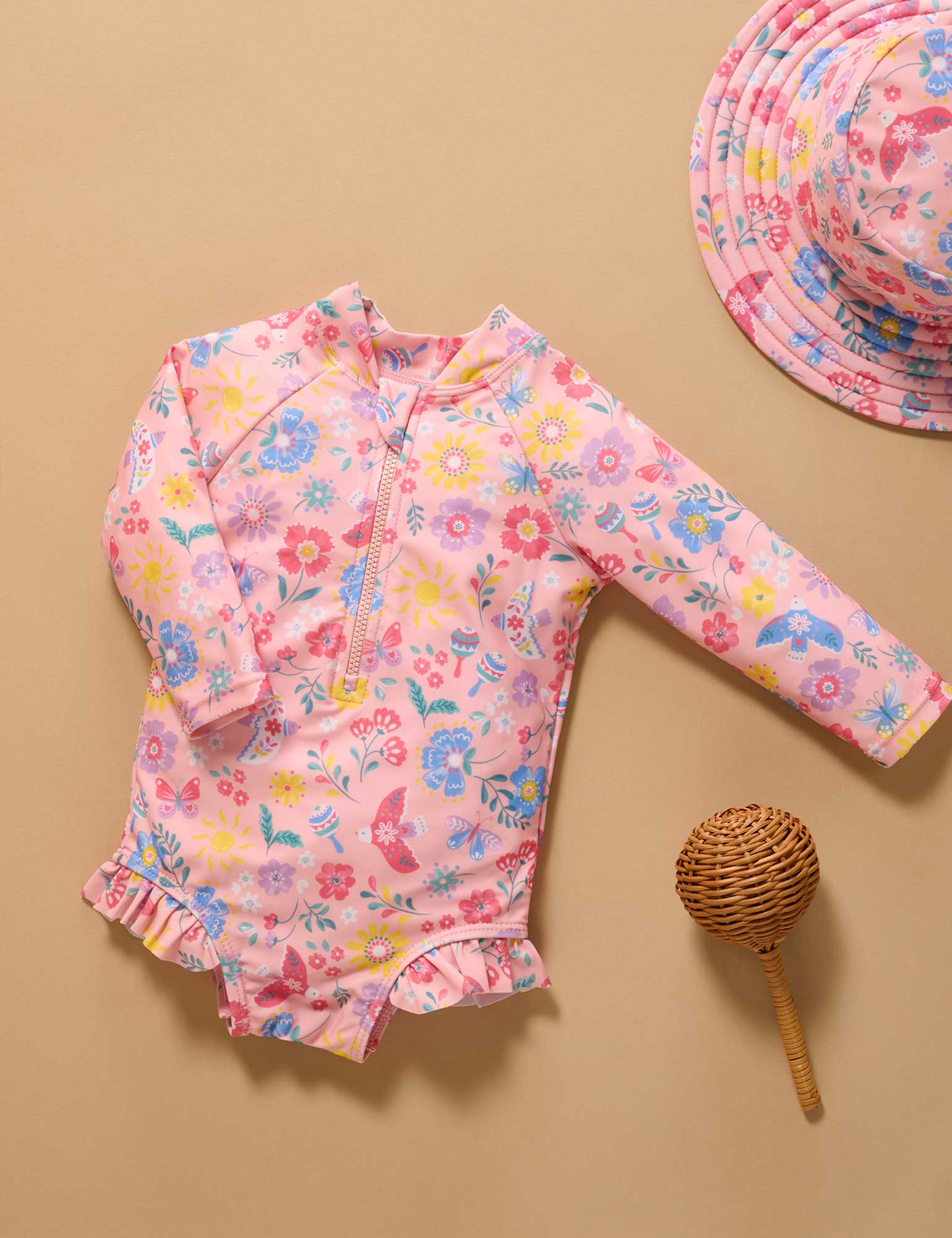 Our classic Long Sleeve Swimsuit is perfect for those long days at the beach or by the pool. Featuring a front zip with safety fold for easy dressing, ruffle trimmings and a sweet all over print. Made from a recycled polyester and elastane blend for a lightweight and breathable suit.