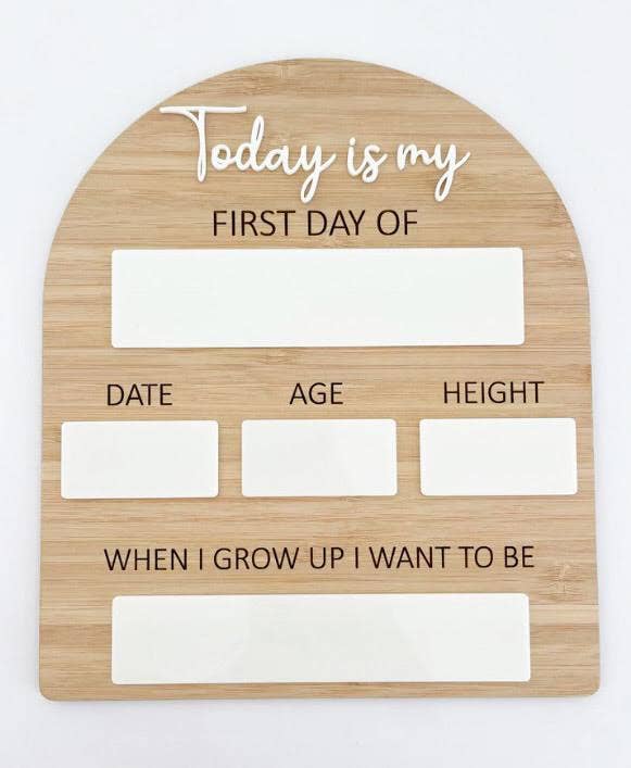 Our first day boards are made on the finest quality bamboo, with acrylic pieces so people can write their details on, all your customers will need is a whiteboard marker to write on them. Height of the board is 26cm width is 22cm making it the perfect size for little ones to hold for a photo! Wording is a mix of engraved and acrylic.