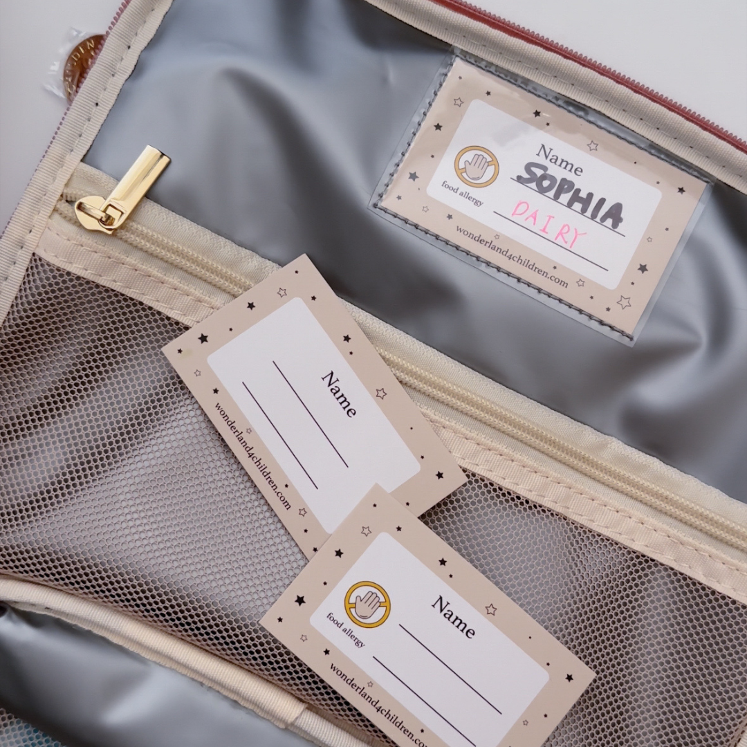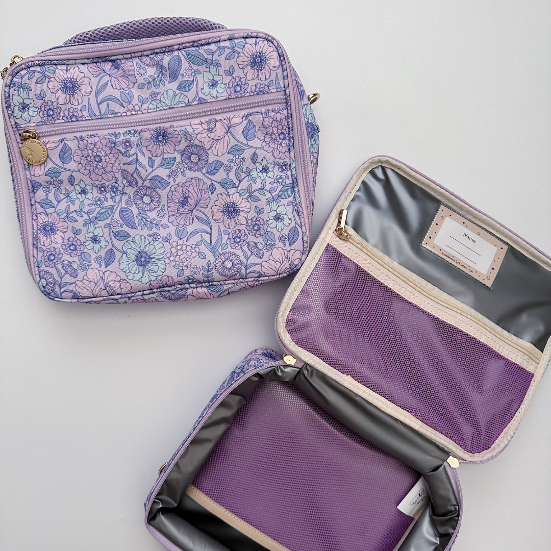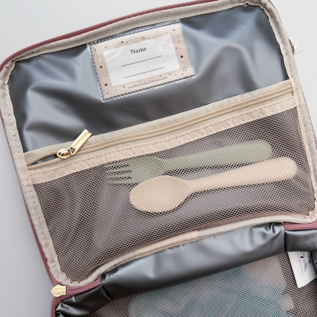 <𝗣𝗿𝗼𝗱𝘂𝗰𝘁 𝗙𝗲𝗮𝘁𝘂𝗿𝗲𝘀> : Water Resistant Surface 1: Unique Design: Fashionable style with coordinated, customizable details. 2: Quality Material: Durable, water-resistant 600-denier polyester. 3: Name Card: Flexible, a rewritable name and allergy awareness cards included. 4: Two mesh sections included: a smaller zippered side for utensils and a larger side to keep an ice pack in place. ** Please note that a lunch box, ice packs, utensils, and a strap are 𝗡𝗢𝗧 included
