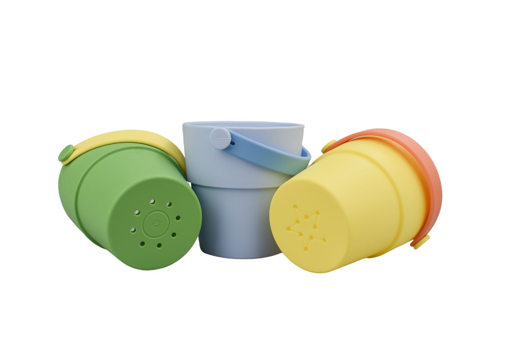 Two of the buckets feature holes in the base, allowing children to explore water flow and experiment with pouring and stacking. The third bucket has no holes, making it ideal for holding water, sand, shells, or other exciting treasures during playtime.