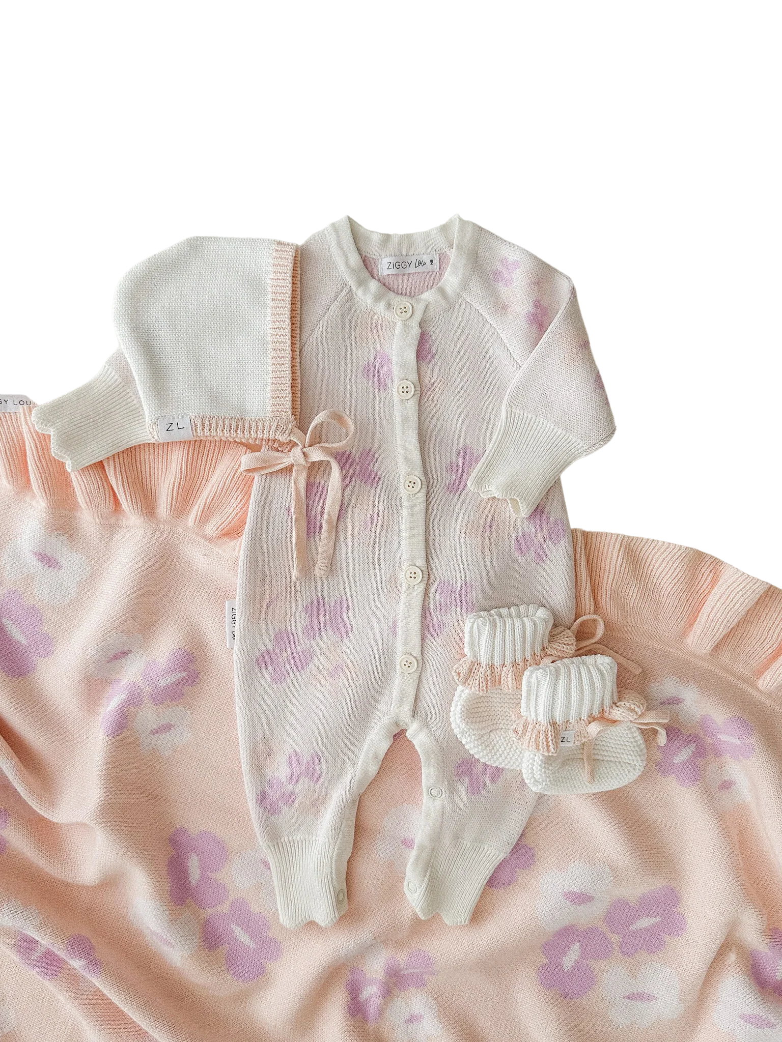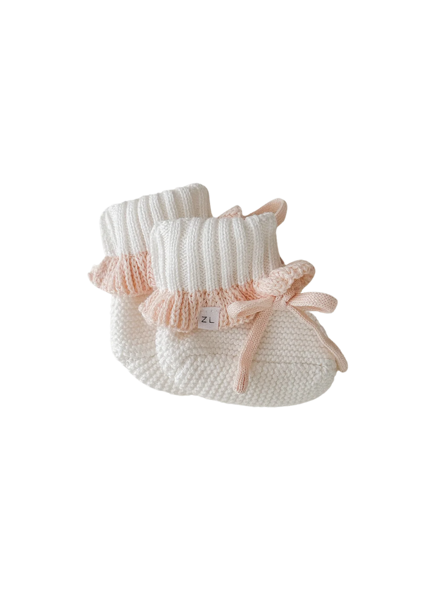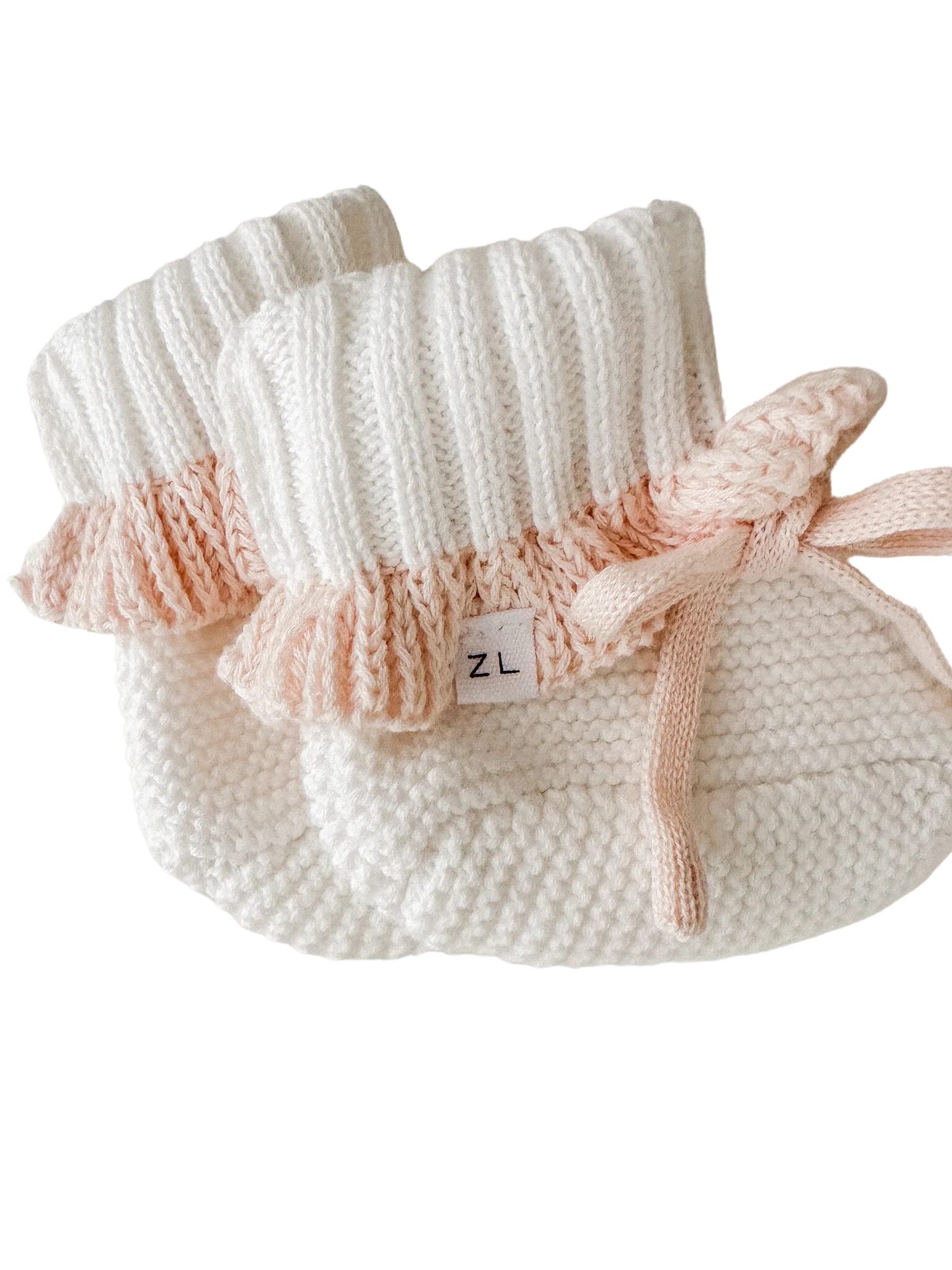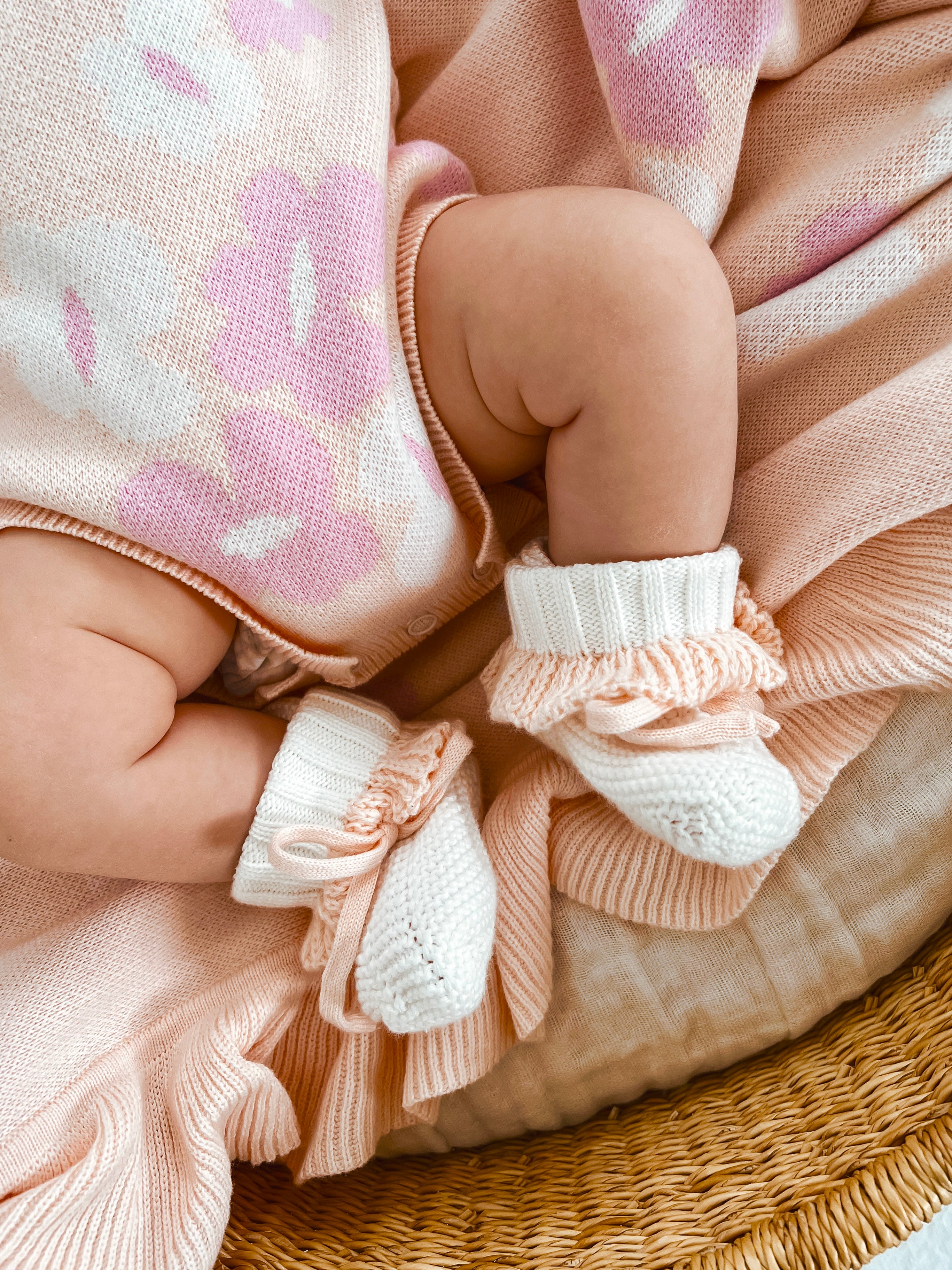 Knitted booties to compliment our Flora Summer Collection. Designed to be a timeless keepsake to remember just how teeny, tiny they were. An heirloom piece to pass down to other siblings or a special something to pop in their keepsake box. Functional drawstring to ensure booties don't fall off when worn. Pair with our Milk/Primrose Bonnet.
