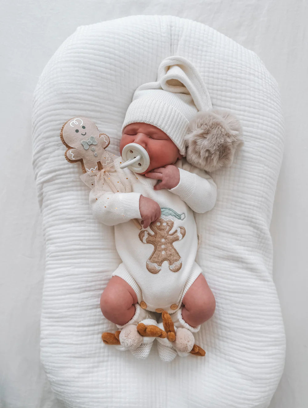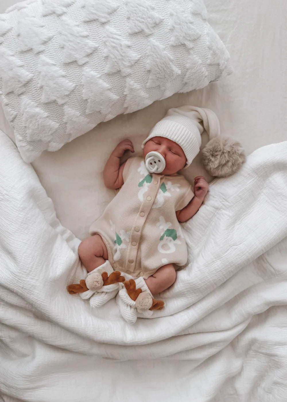 Our knit pom reindeer booties are the perfect little accessory to keep your little ones feet warm this Christmas. They're made from 100% cotton, featuring a tie at the back to secure them on.