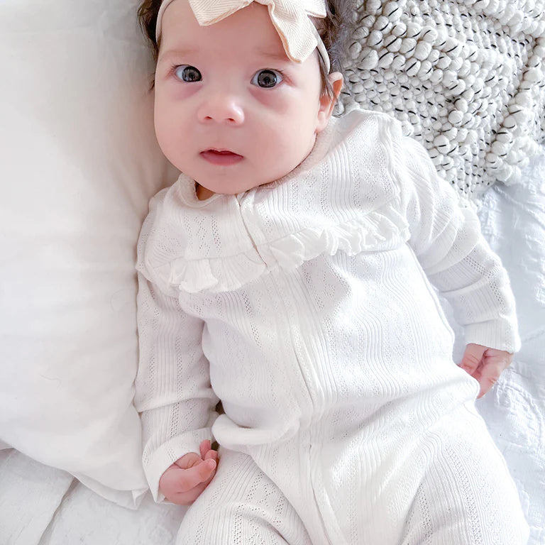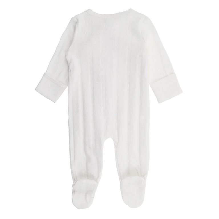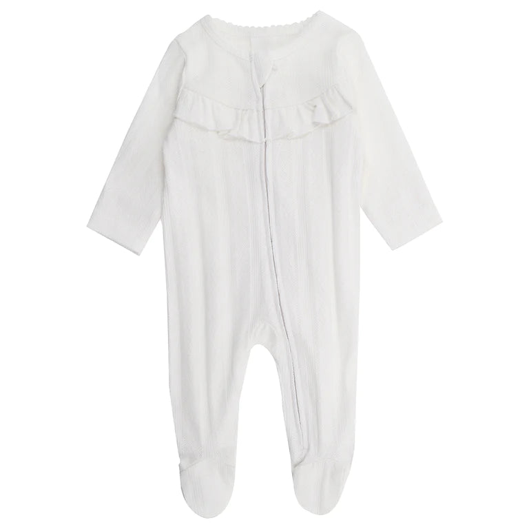 Made from 100% GOTS Certified Organic Cotton and Dyes making this long sleeve romper super soft and comfy on baby's skin. Featuring an all over pointelle design, with a zip front for easy dressing, front yoke frill, enclosed feet, inbuilt fold over cuff mittens and picot trimmed neck bind, making it the perfect basic for your baby's wardrobe .