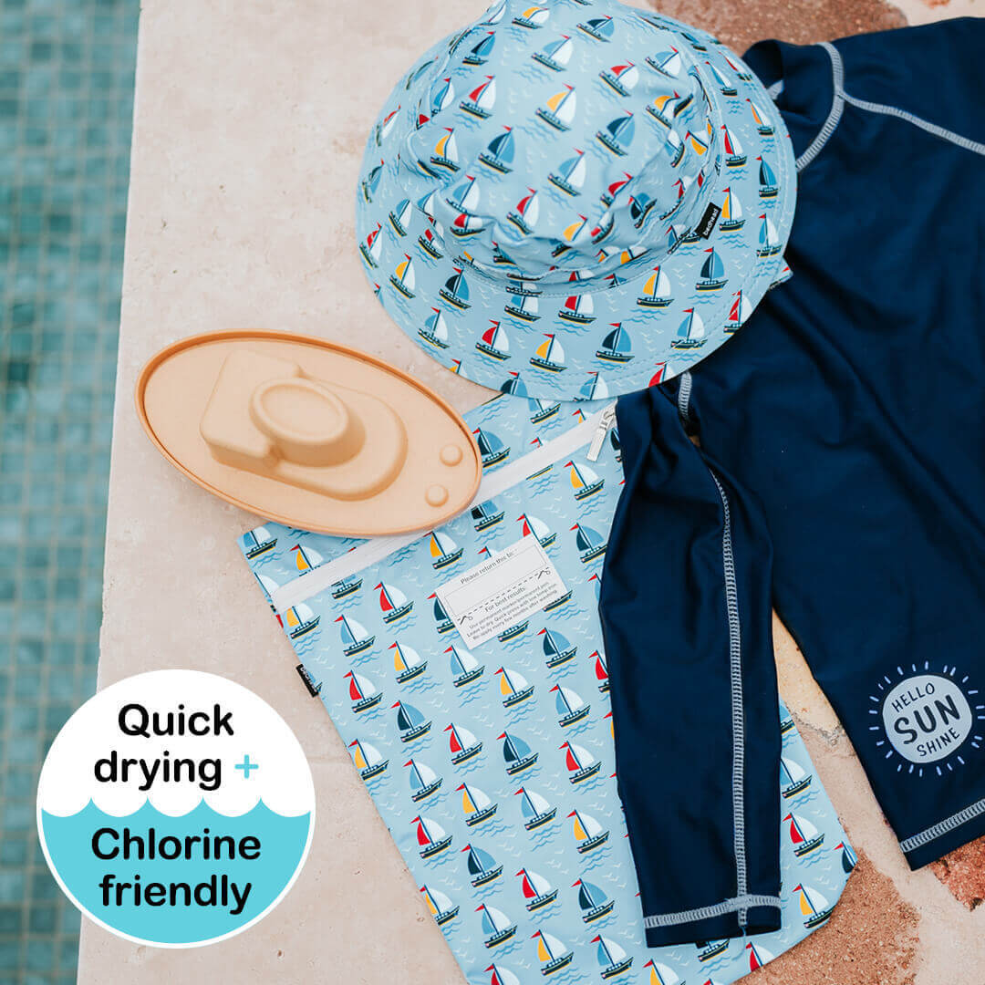 For little lovers of the deep blue sea, these cute sailboards with white, blue, yellow and red sails need a Marine or Slate rash vest to complete the look! Available in Legionnaire, Classic Bucket and Wet Bag.