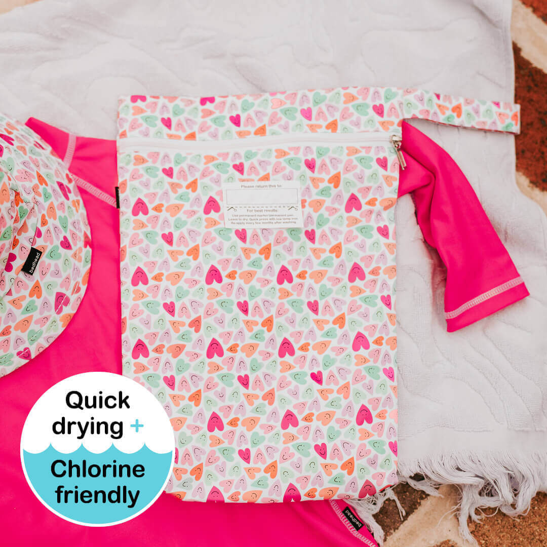 Simply wring out wet cossies, pop them in Wet Bag and close the zip. Available in our range of coordinating Swim hat prints - your little one will be the coolest kid this season!