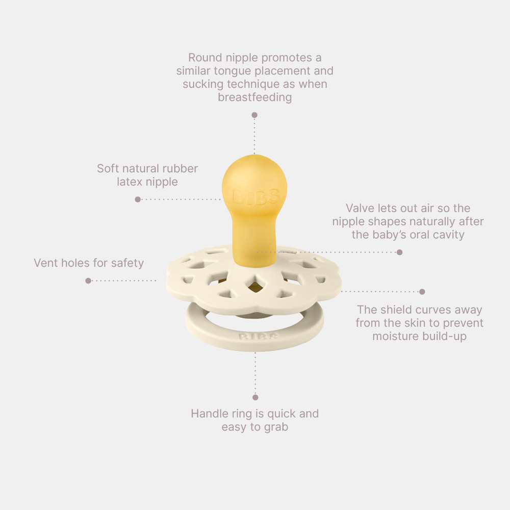 The Boheme pacifier is inspired by the modern bohemian style. With its natural elements and organic silhouette Boheme appears in a fresh, creative, and aesthetic design.
