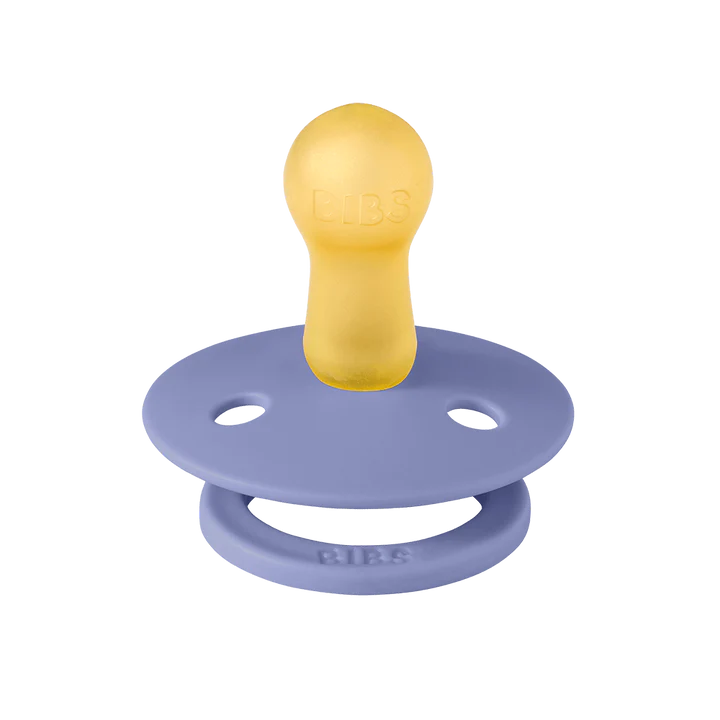BIBS Colour pacifier is the original BIBS pacifier and has been on the market for over 40 years. It has the signature round BIBS shield with three vent holes and round BIBS engraved handle ring.