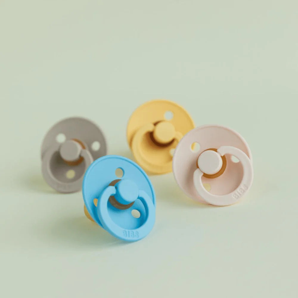 BIBS Colour pacifier is the original BIBS pacifier and has been on the market for over 40 years. It has the signature round BIBS shield with three vent holes and round BIBS engraved handle ring.