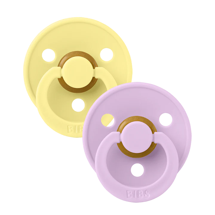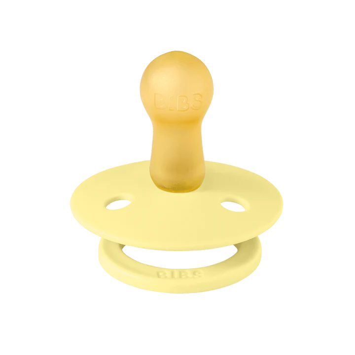 BIBS Colour pacifier is the original BIBS pacifier and has been on the market for over 40 years. It has the signature round BIBS shield with three vent holes and round BIBS engraved handle ring.