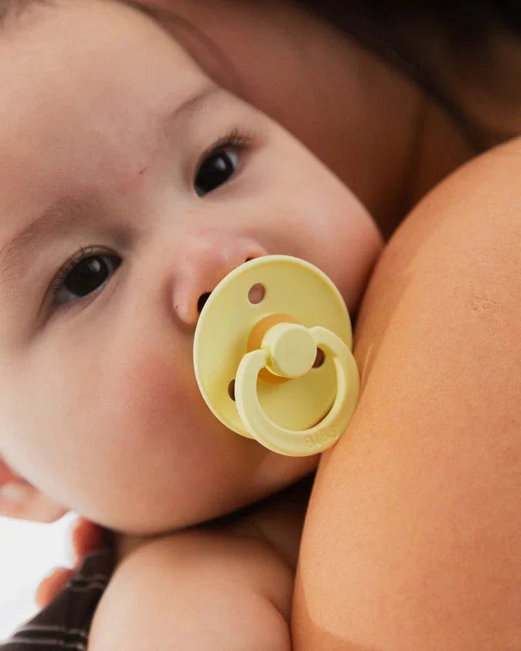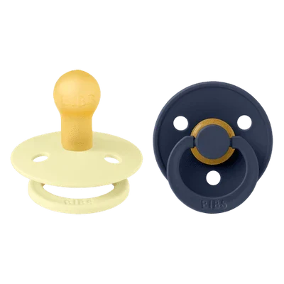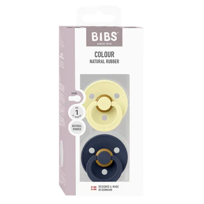 BIBS Colour pacifier is the original BIBS pacifier and has been on the market for over 40 years. It has the signature round BIBS shield with three vent holes and round BIBS engraved handle ring.