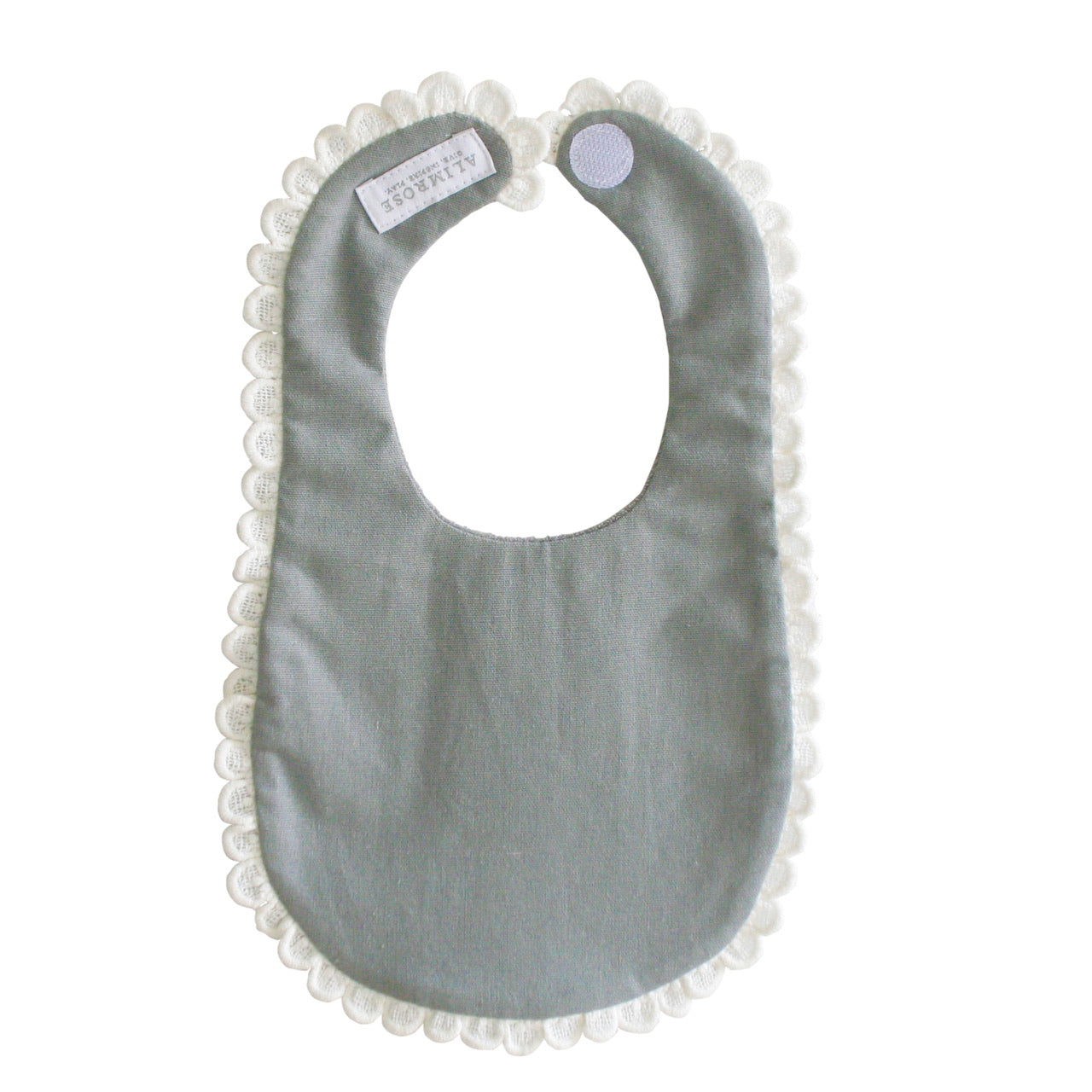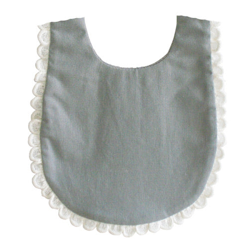 Gorgeous grey linen bib with a lace edge.Very stylish for meal times. Velcro closure. Machine washable.