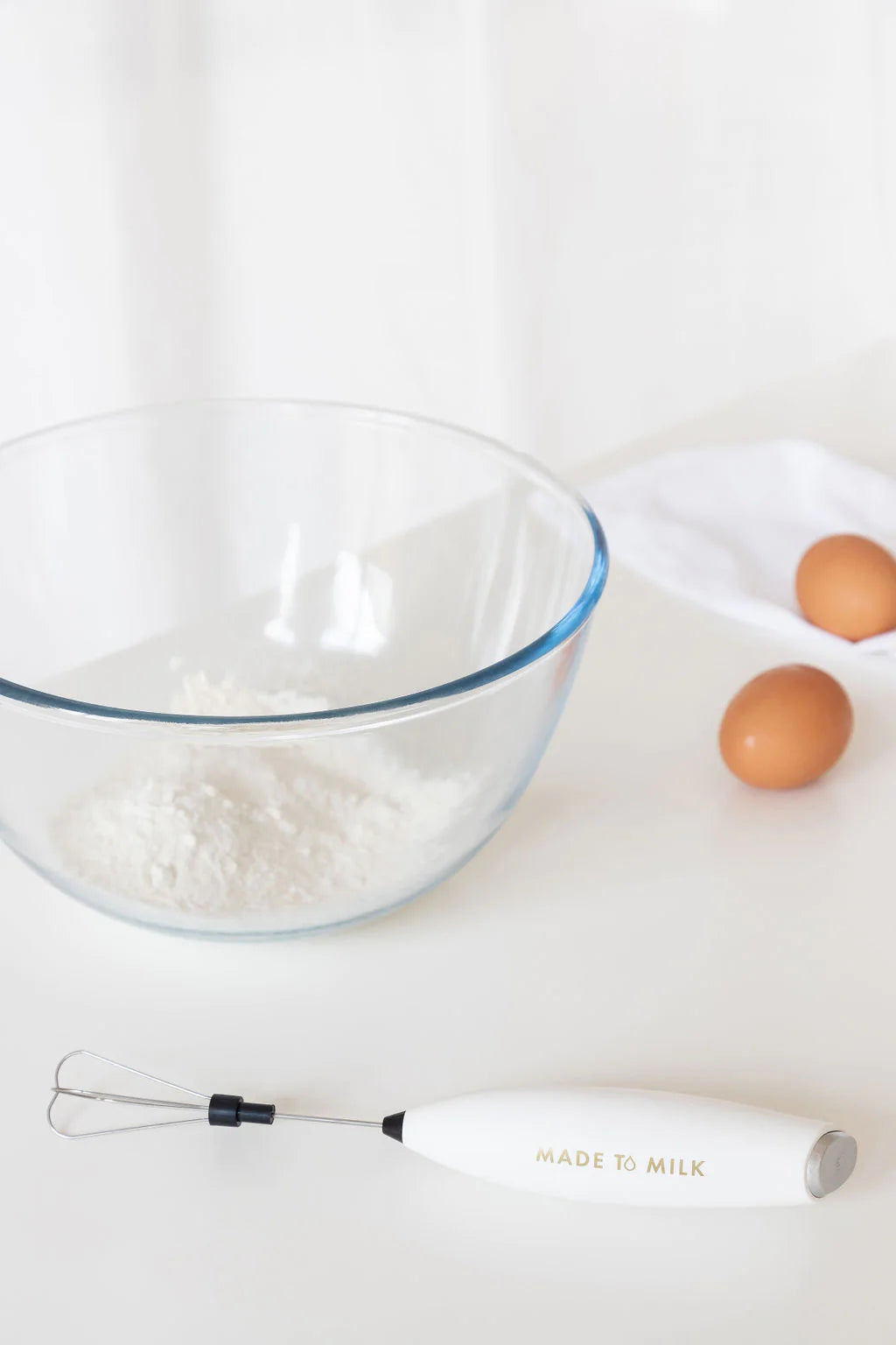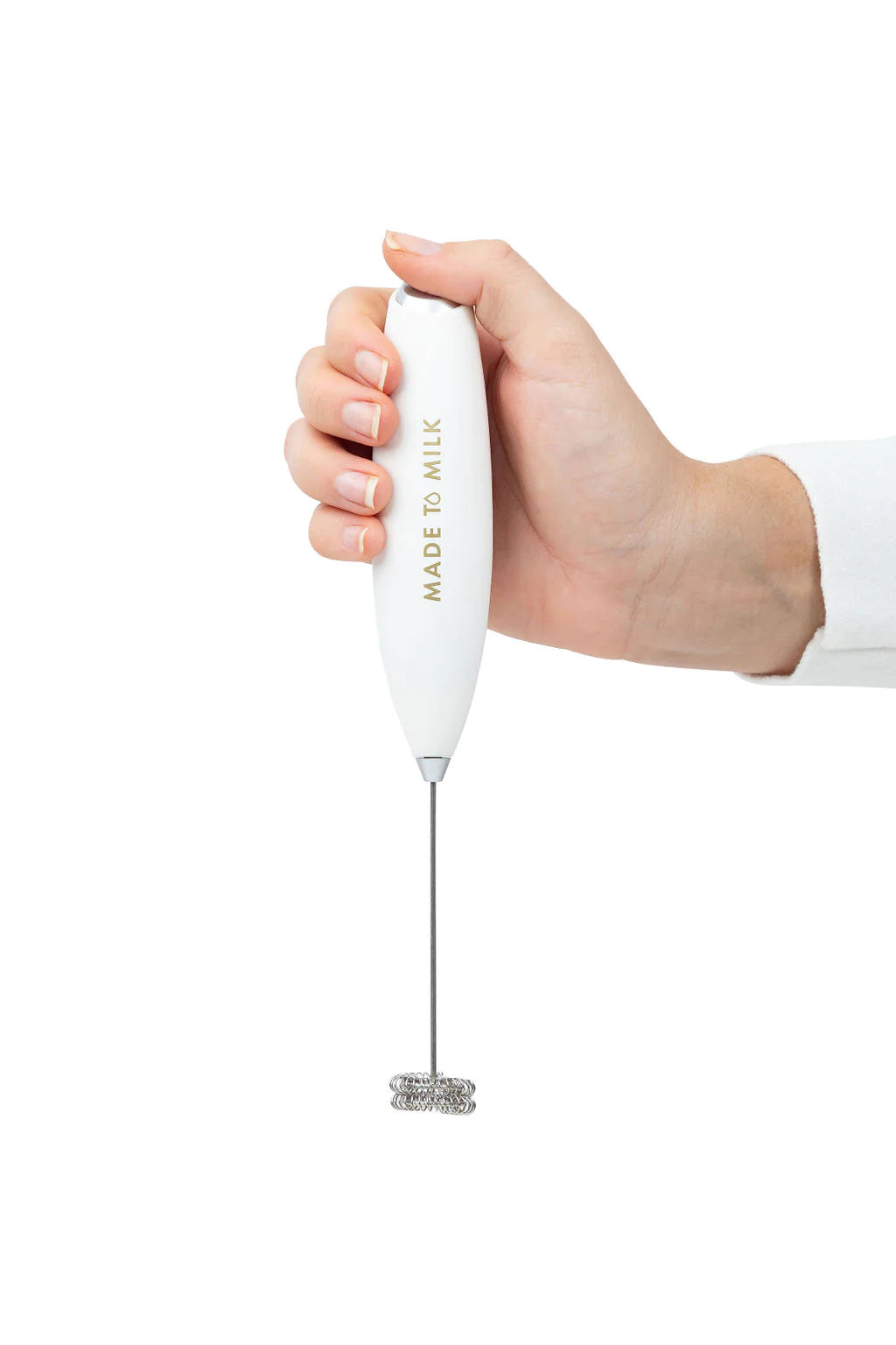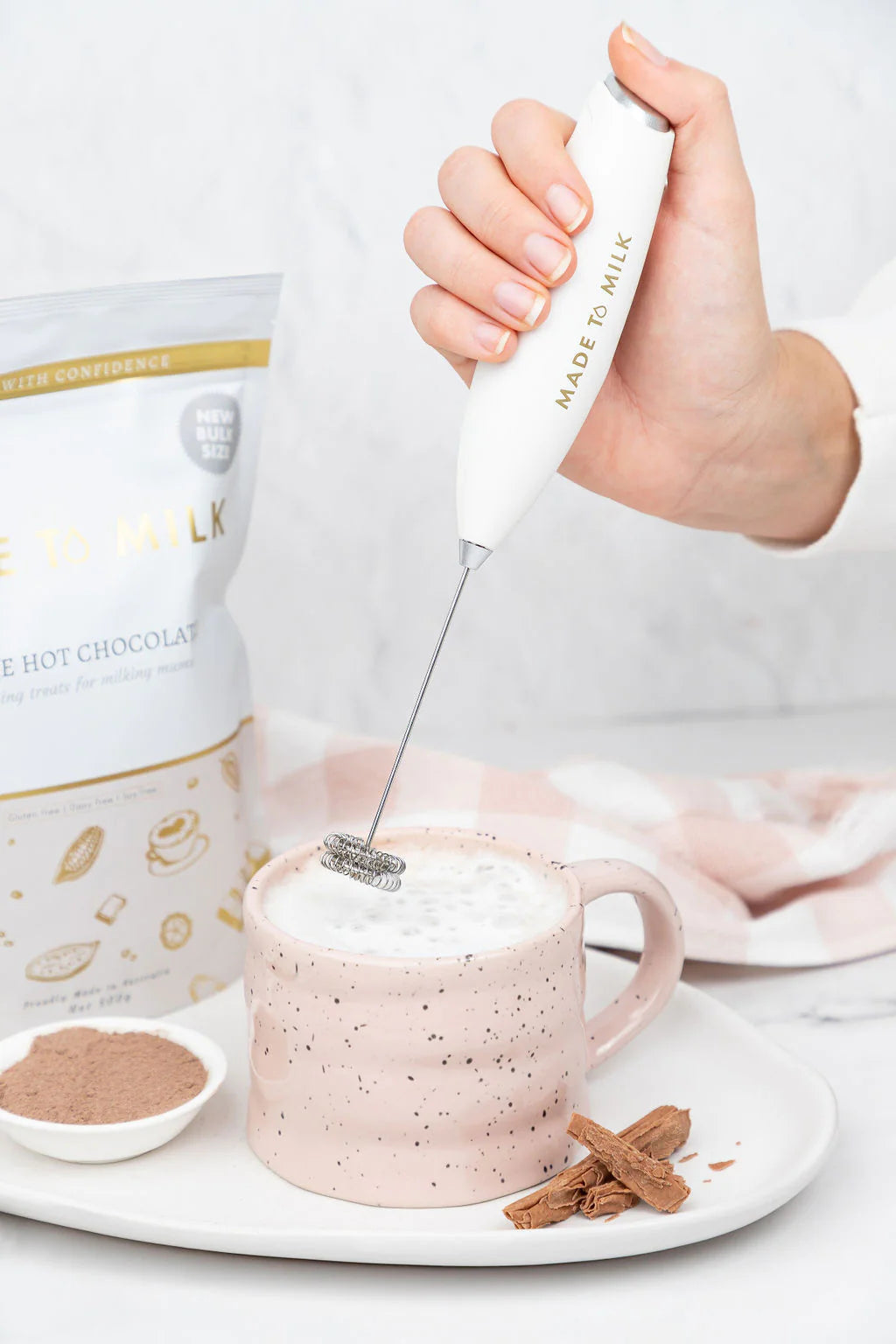 Froth your Hot Chocolate to smooth perfection with our NEW M2M Electric Milk Frother. This sleek and powerful milk frother also comes with a bonus whisk attachment to use with our cookie packet mixes!