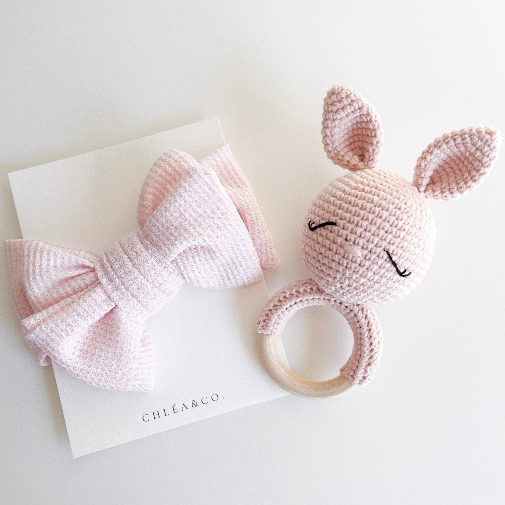 Pink Bunny Rattle & Waffle Bow Headband Set