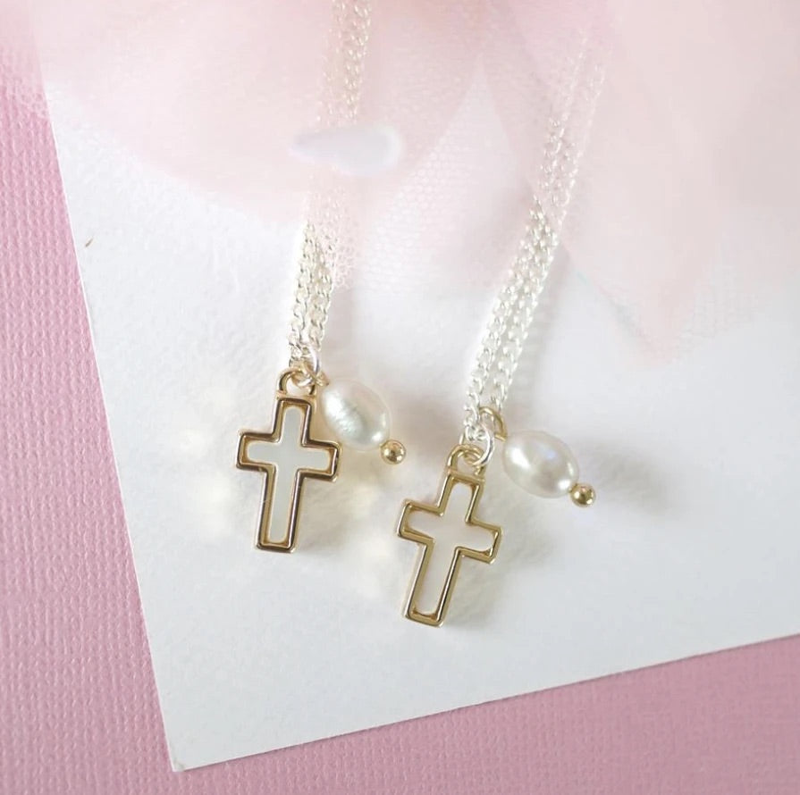 Strength, resilience, kindness, and humility, all things present in the symbols of this necklace and in those who wear them. Devotional and chic, a mother/daughter pair in this gorgeous necklace set with the exquisite freshwater pearls and graceful gold cross pendants is certain to stand out for their charm and beauty.