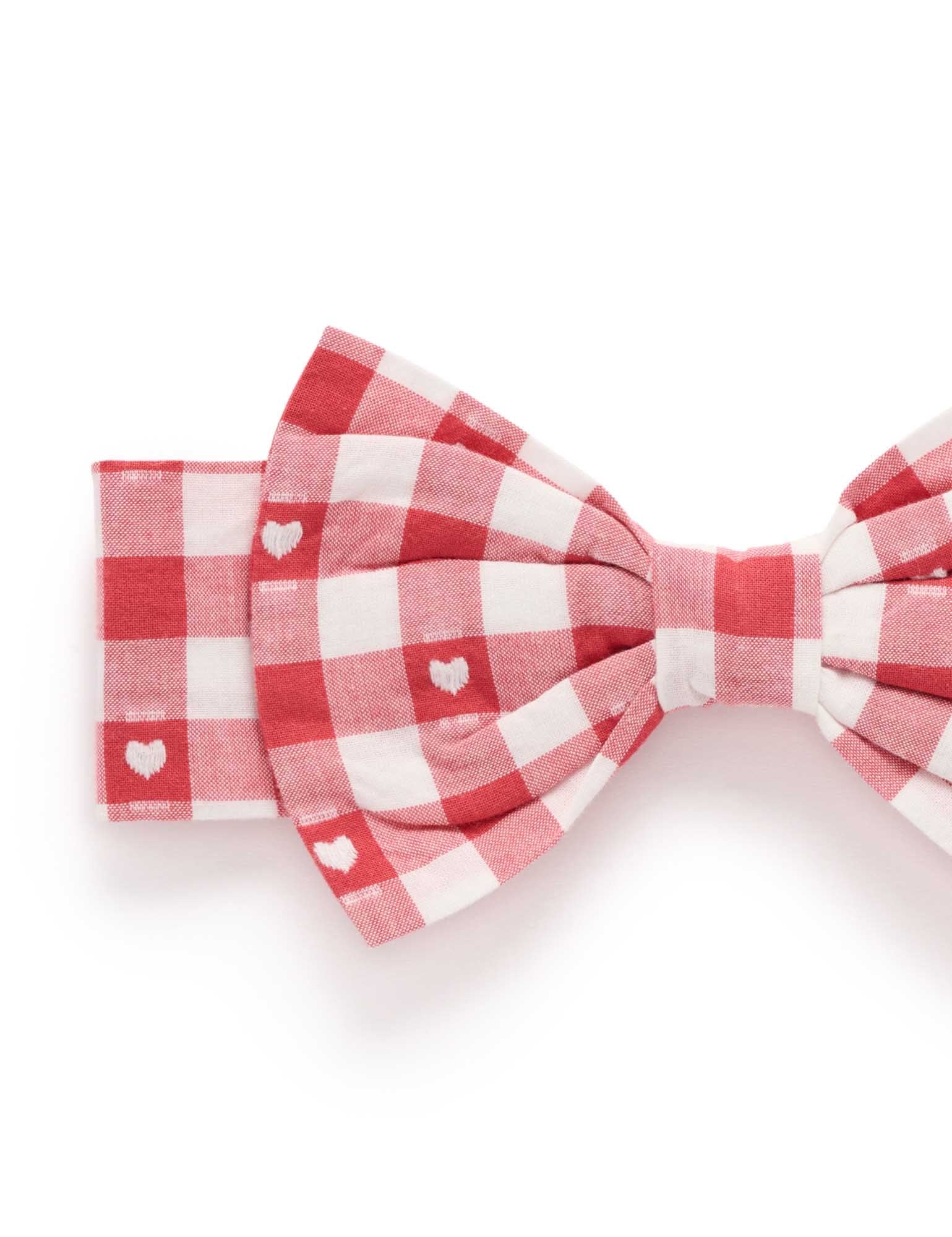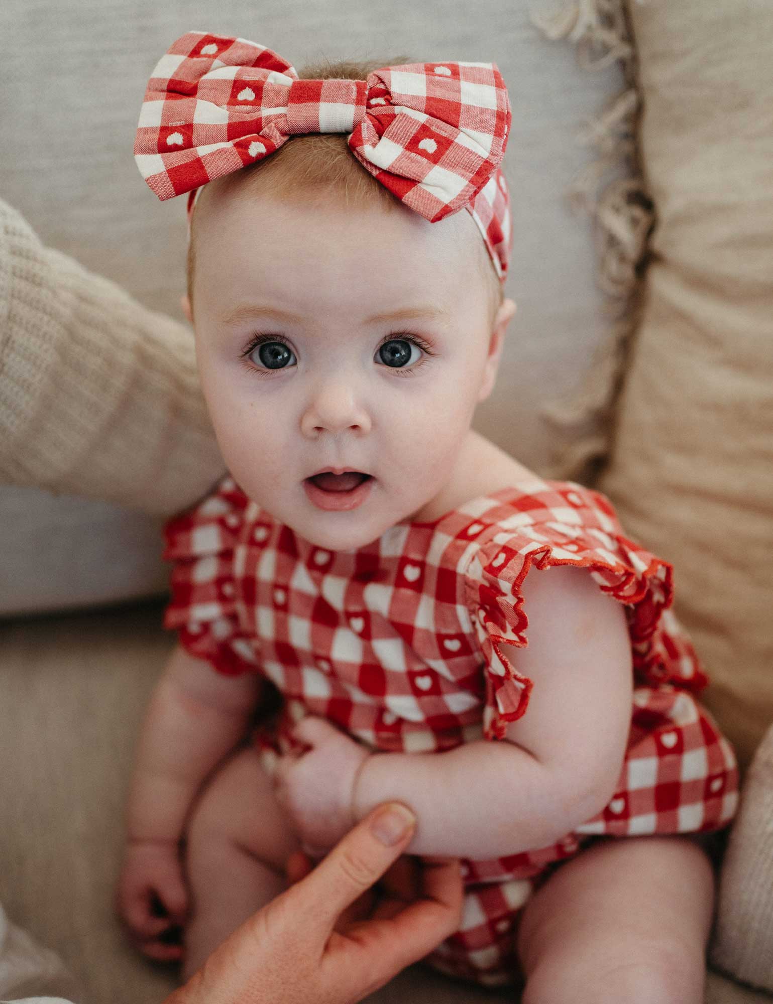 Our Heart Gingham Bow Headband makes the sweetest festive accessory to add to your little ones outfit. Featuring a big bow on an elasticised strap with a velcro closure. Made from soft 100% Organic Cotton in an all over gingham pattern with little hearts.
