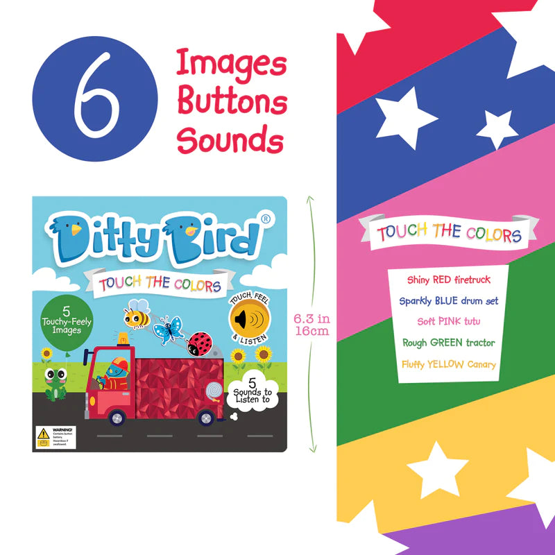 Come and explore the world of colours with Ditty Bird in this "Touch & Feel" board book that's perfect for little ones to learn and develop their fine motor skills. With 5 real-life sounds and 5 beautiful textures to touch and feel, your child will have a blast discovering new colours. This charming book is a valuable learning tool for developing sensory and language awareness, making it an excellent gift for your little one. The book features: