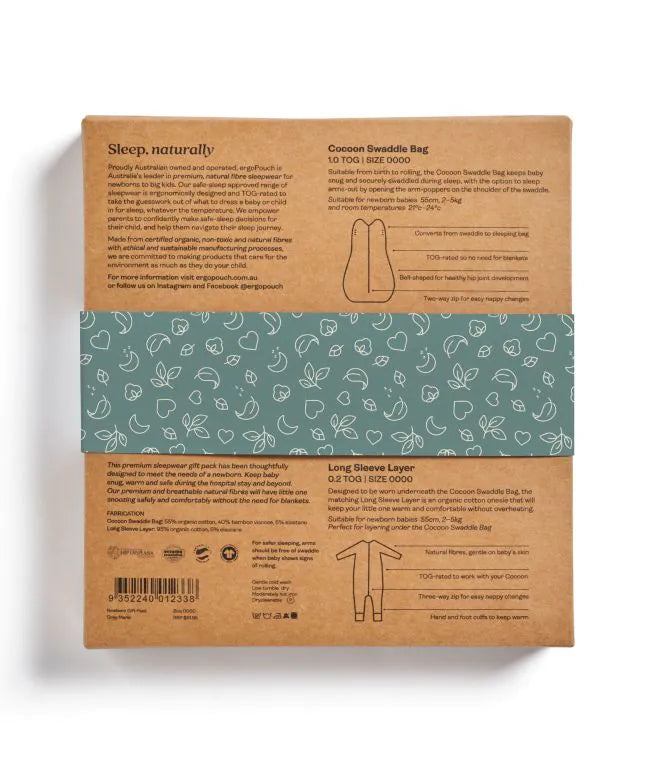 Looking for a new baby gift that isn't flowers or balloons? Treat new parents to a thoughtful, useful and sustainable gift for their sweet new babe with the ergoPouch Newborn Gift Pack. Beautifully presented in a kraft gift box with clear sleeve, this newborn gift set includes two must-have products in a gender-neutral print that will help tired parents navigate the early days of sleep, the simple way: