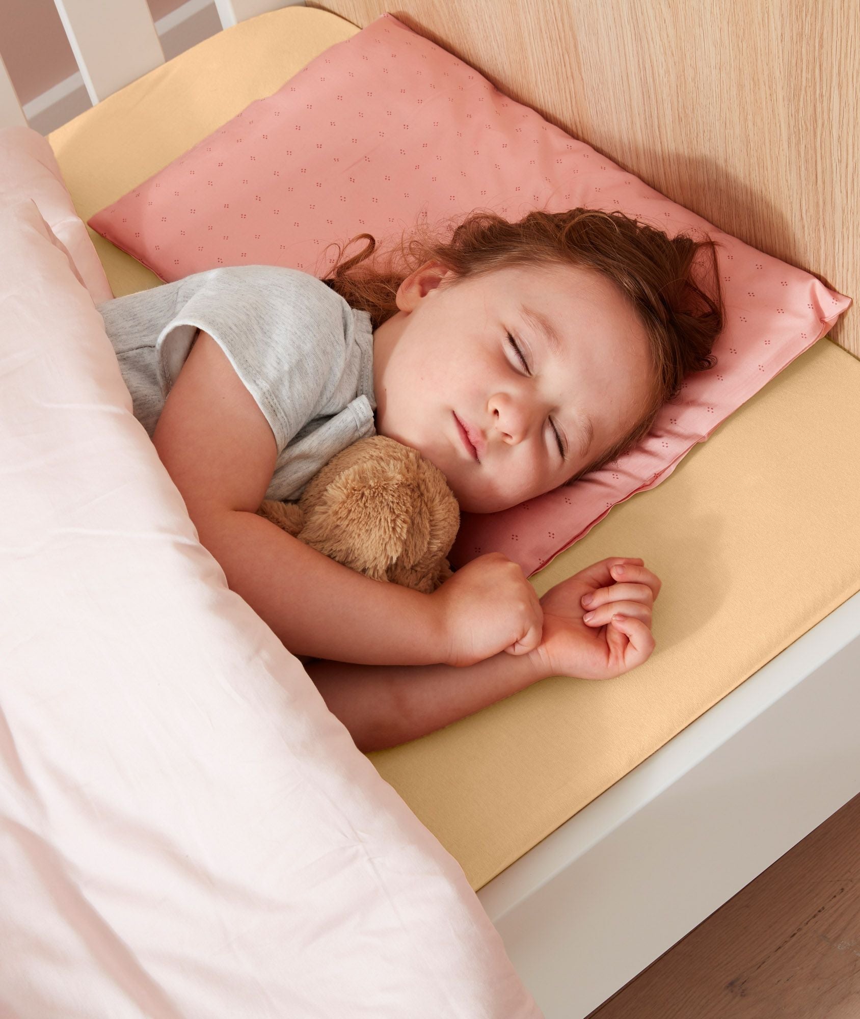 Introduce the pillow with case into the cot, or a cot mattress on the floor, from 2 years of age.