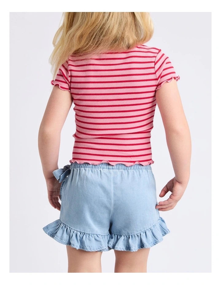 The Hazel Skort by Eve Girl is the ultimate summer piece. This skort includes internal shorts and skirt front panel, with an elasticated waistband, self fabric frill and side tie detail on a soft chambray fabrication. Pair with a graphic tee for an everyday look.