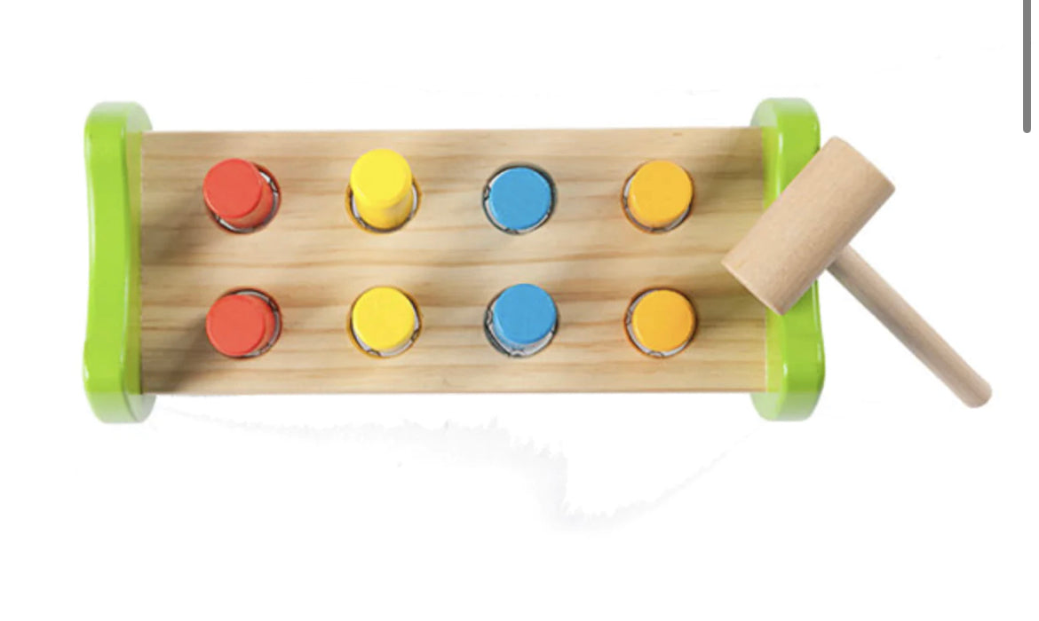 - Colorful wooden bench with pegs to pound on with the wooden mallet