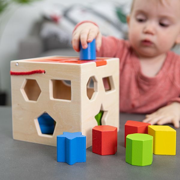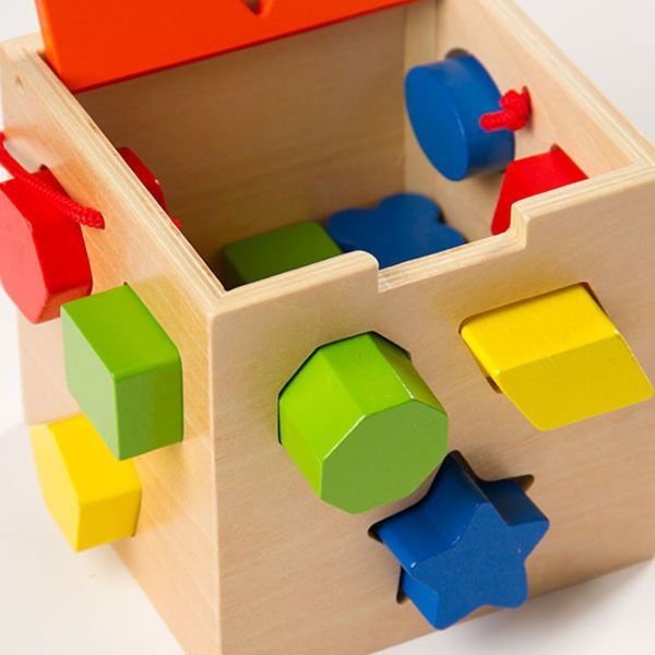 Cut out of four sides of this natural-finish wooden cube are precise slots shaped to match each of the twelve vibrant blocks.