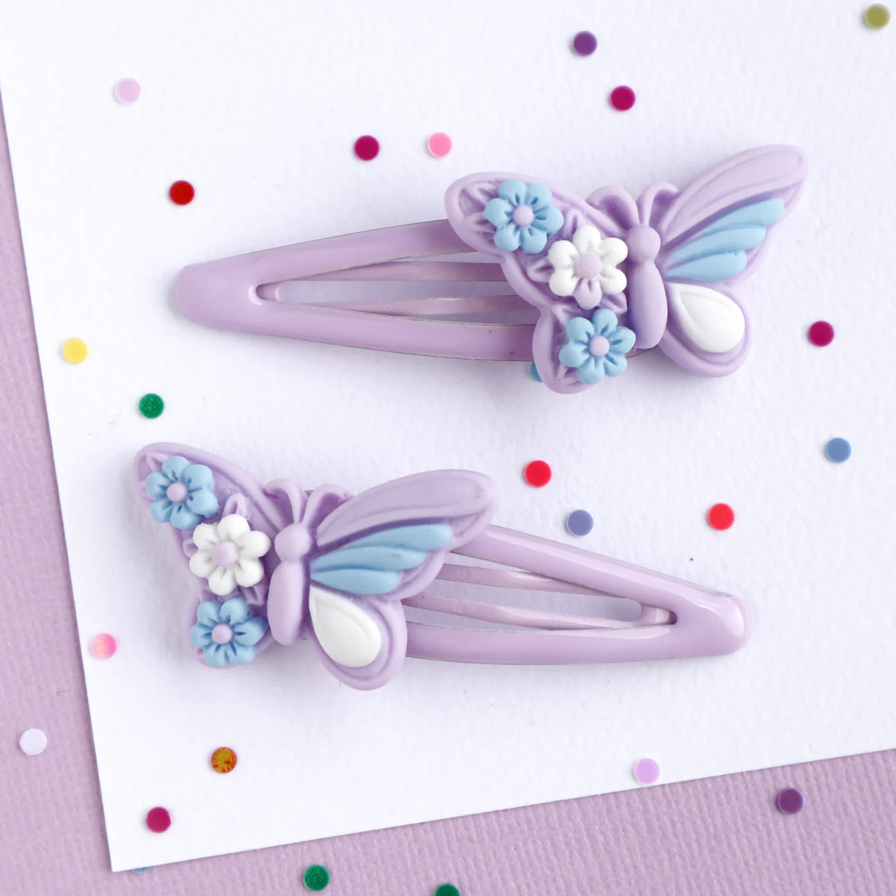 Style their hair with cuteness and imagination and Lavender Butterfly Hair Clips! Just like little ones, butterflies give a vibe of joy and freedom, not caring who is looking and fluttering the day away. White and blue flowers and wing segments are highlighted on the charming lavender base of the clips.