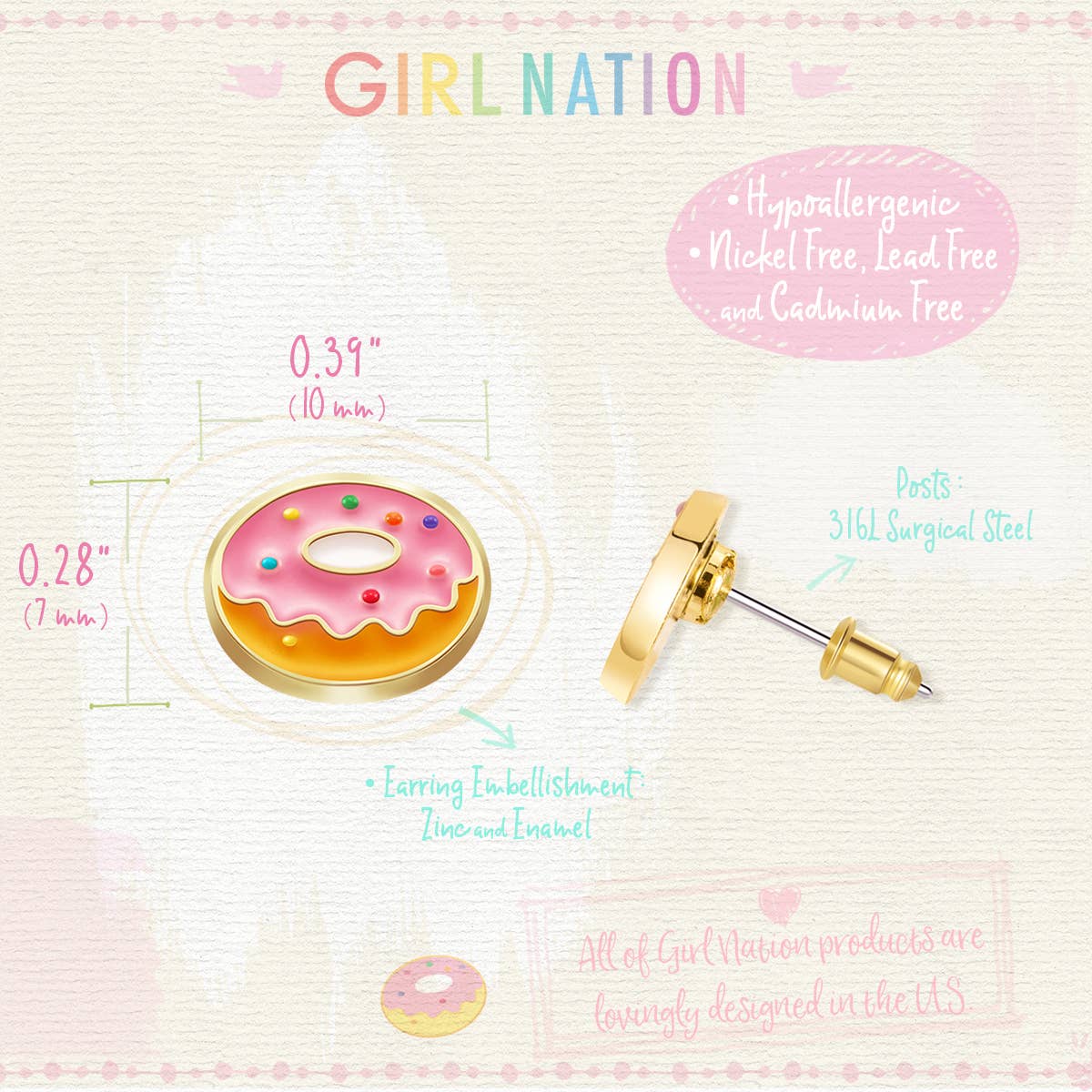Girl Nation’s bestselling Cutie Earring Collection celebrates girls and their favorite things! Give her grown-up quality with hand-painted enamel earrings that allow her to express herself and her own unique style!