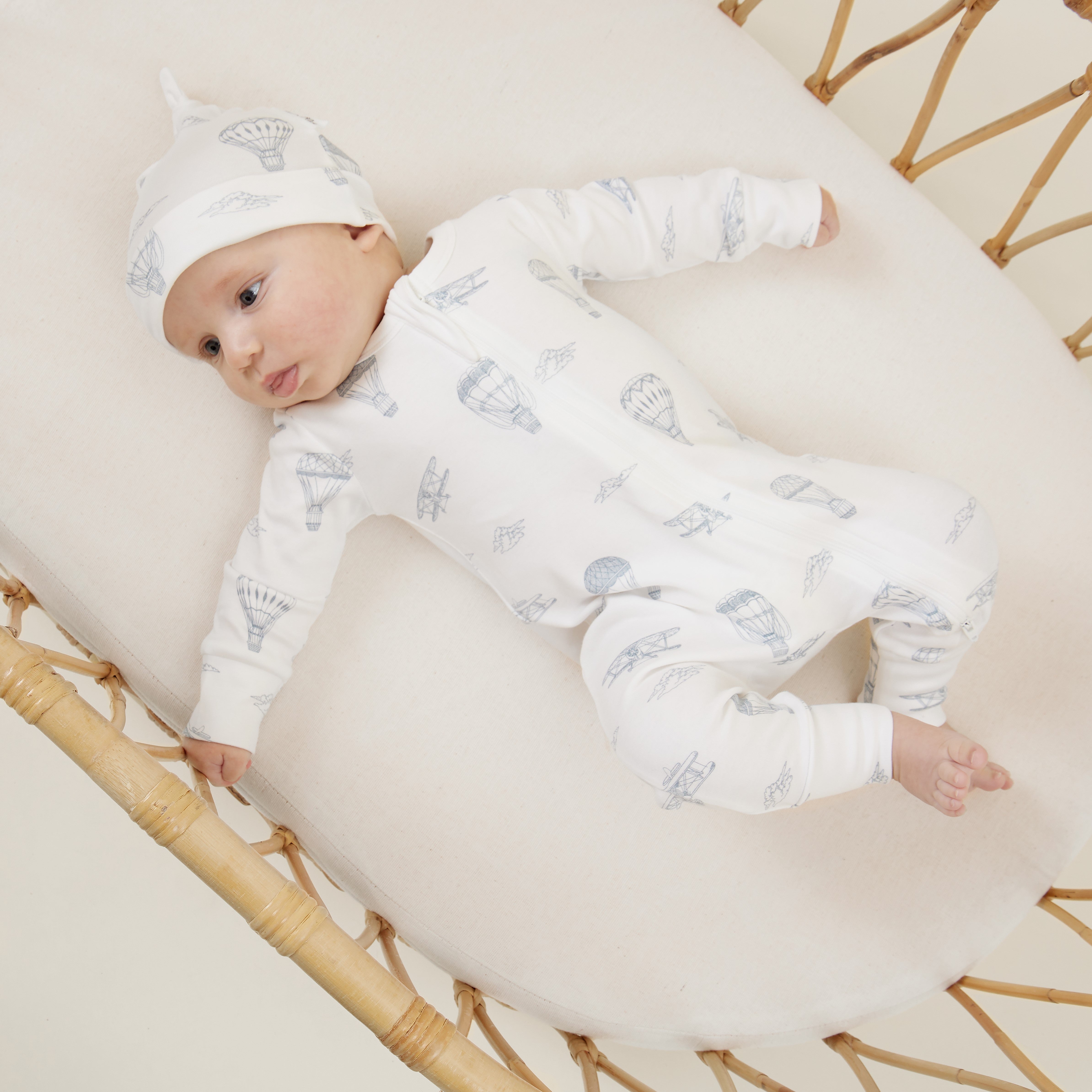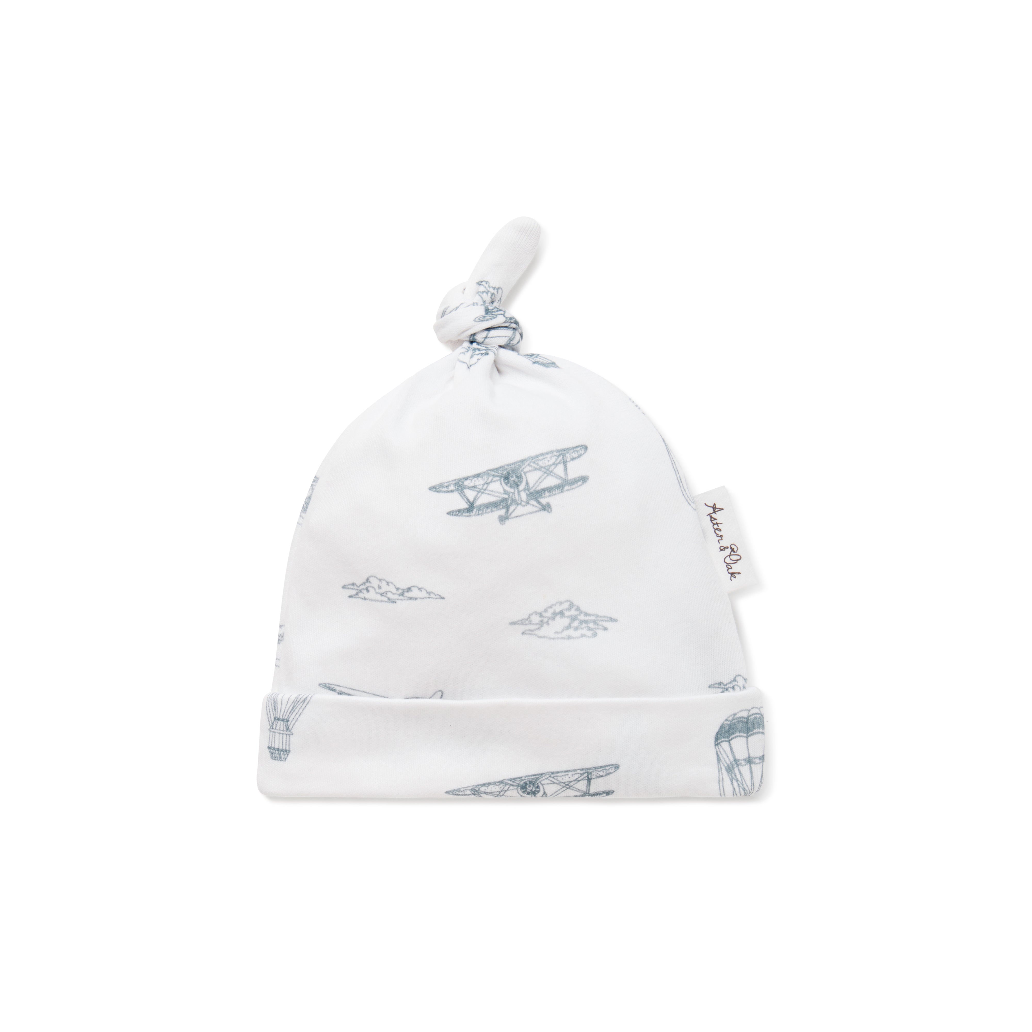 Made with GOTS certified organic cotton, this hand illustrated air balloon hat features an adjustable knot that can be altered to fit your babys head perfectly.