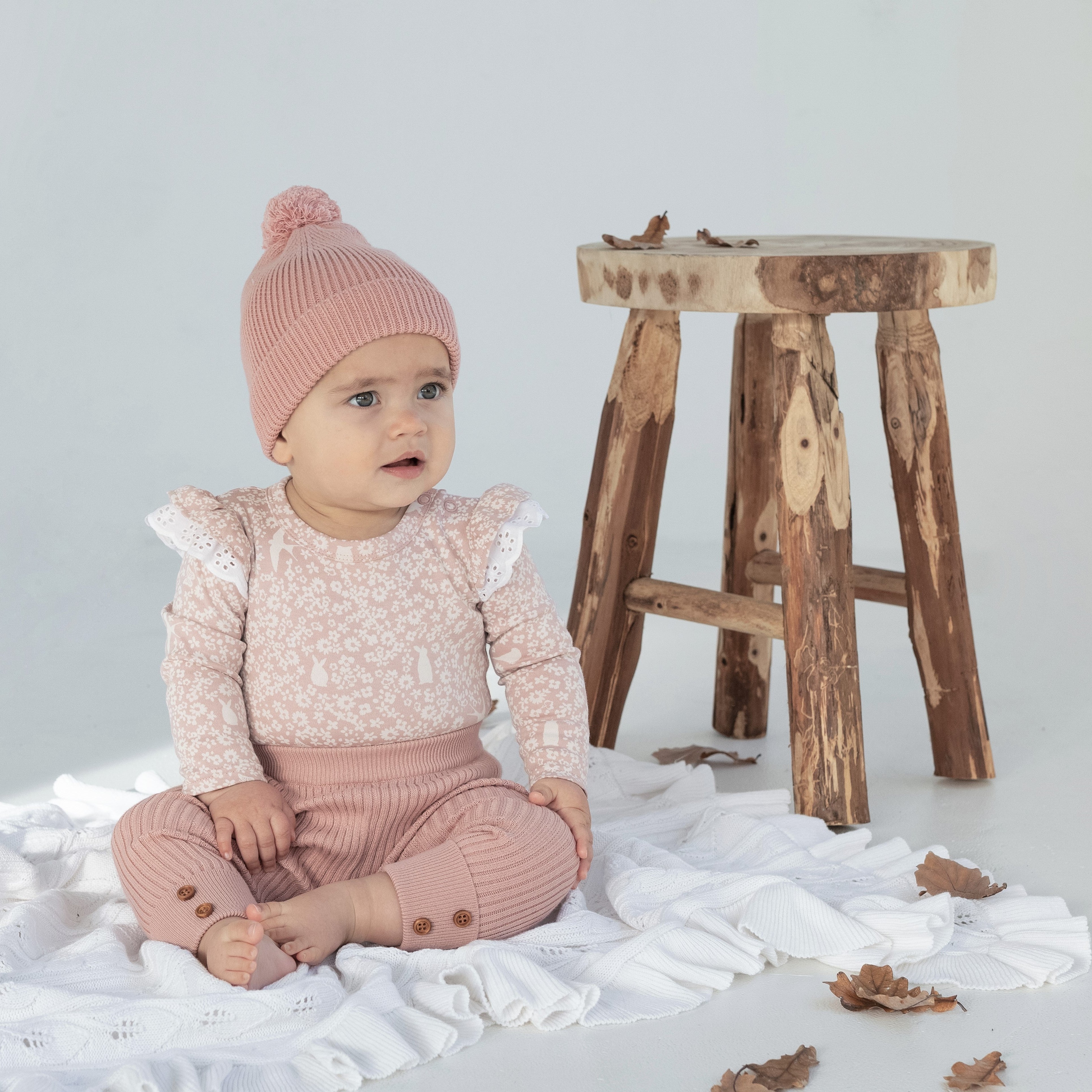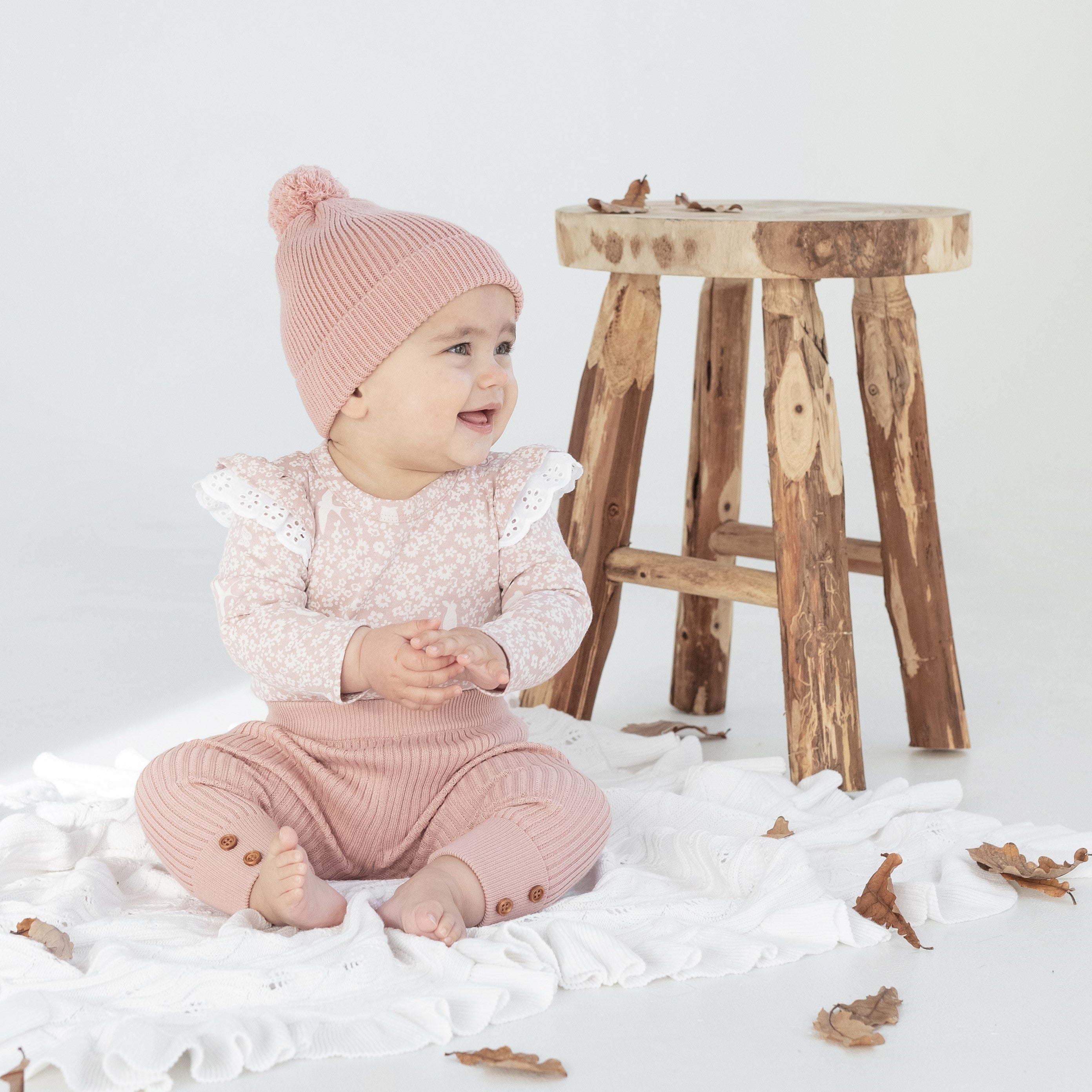 Made with 100% GOTS certified organic cotton, these rose knit leggings feature cuffs and buttons to the legs, are soft, stretchy and won't lose their shape.