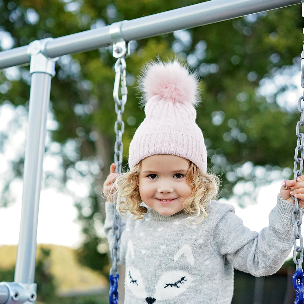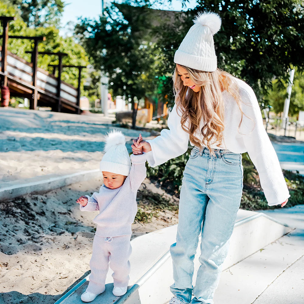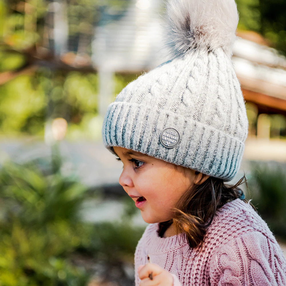 The Aurora Beanie features a soft pom pom crown, cable knit body and a rolled up rib knit front.