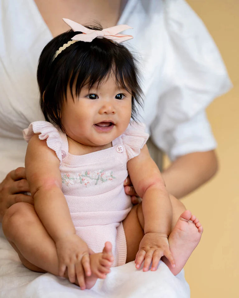 A sweet summer staple with vintage charm, this knitted romper is made for sunshine days and picture-perfect moments. Featuring fluttery shoulder frills and delicate hand embroidery across the chest, it's a beautifully crafted piece designed for comfort, style, and a touch of whimsy. Perfect for special outings or sunny playdates, layered with a bodysuit or worn on its own.