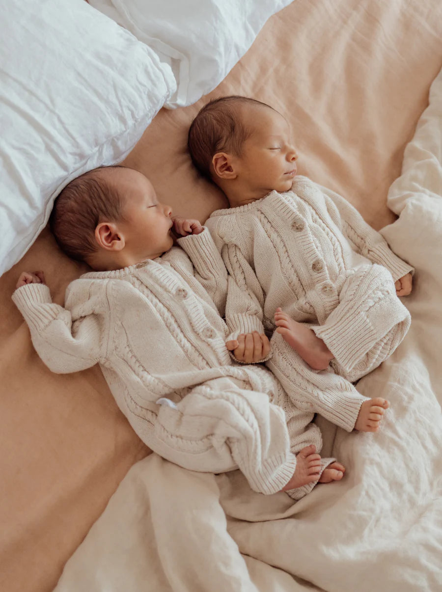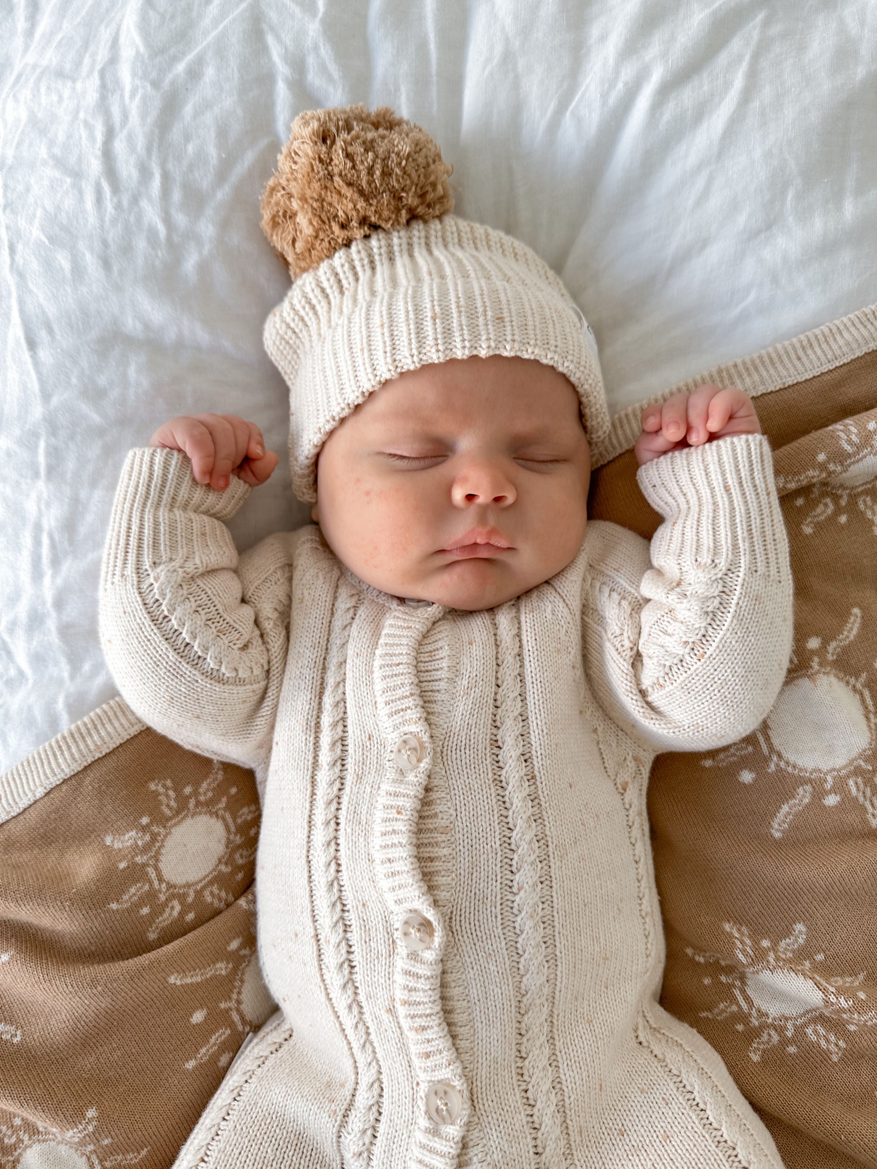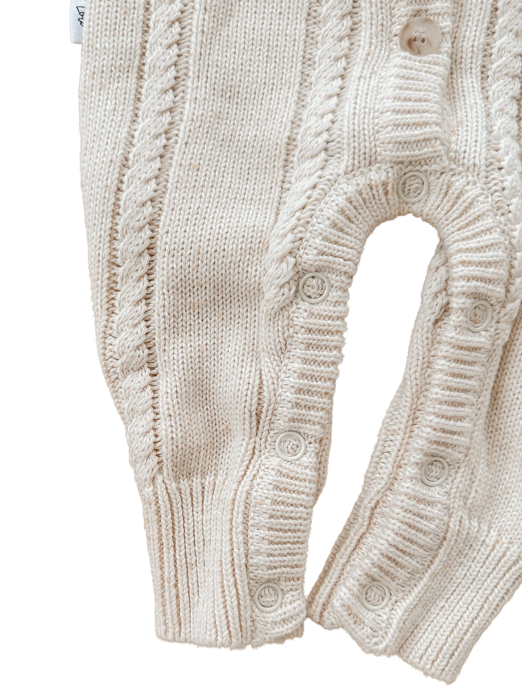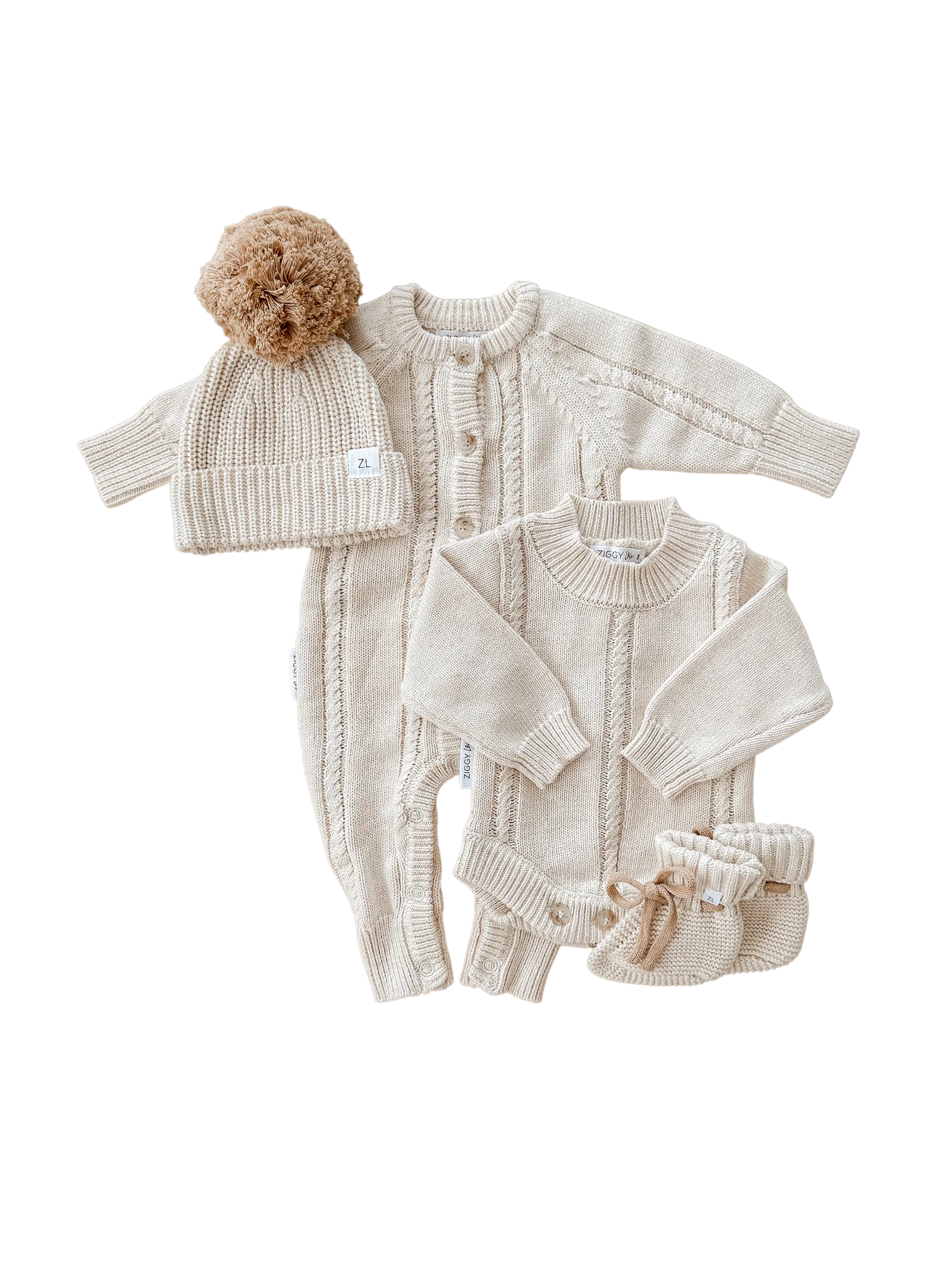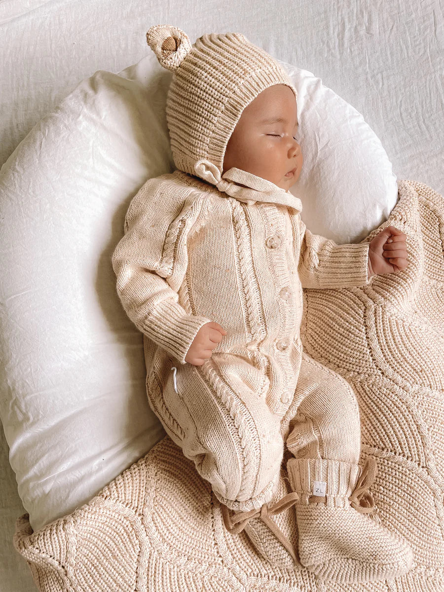 A beautiful knitted Biscotti Fleck romper, with gorgeous braid detail is designed with comfort in mind. Designed to be a timeless keepsake to remember just how teeny, tiny they were. A high quality piece to pass down to other siblings or a special something to pop in their keepsake box. Functional snaps at crotch for easy nappy changes. Pair with our Biscotti Fleck Beanies + Booties for the perfect winter outfit.