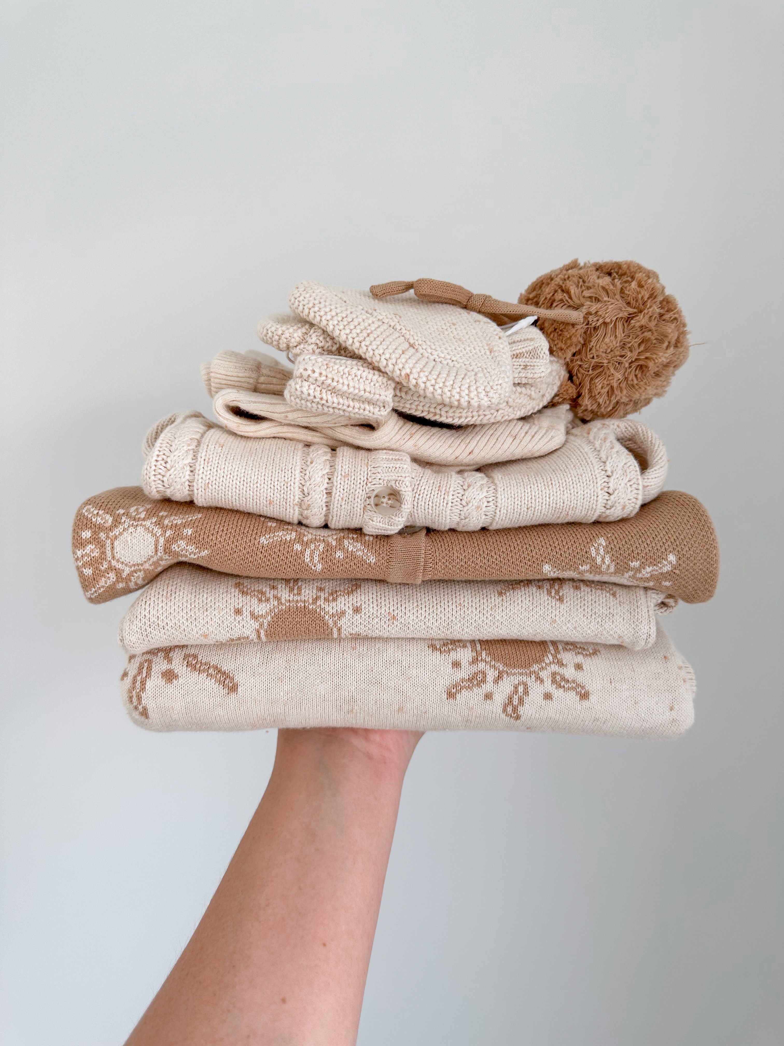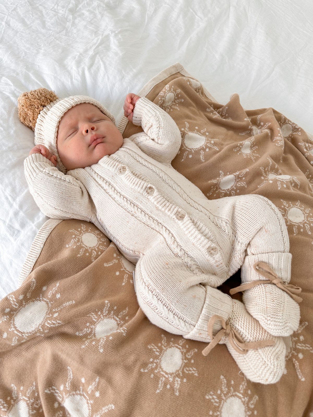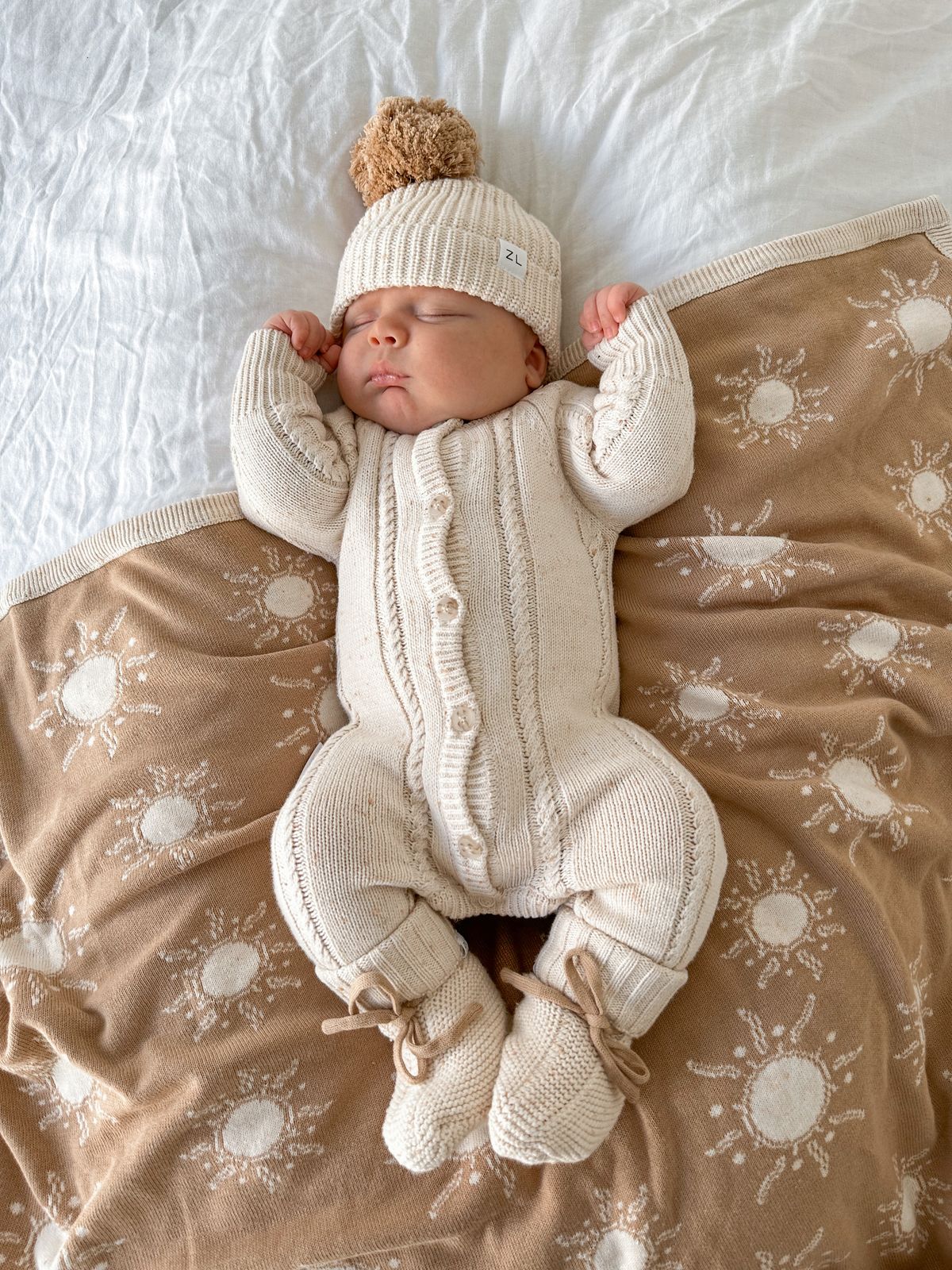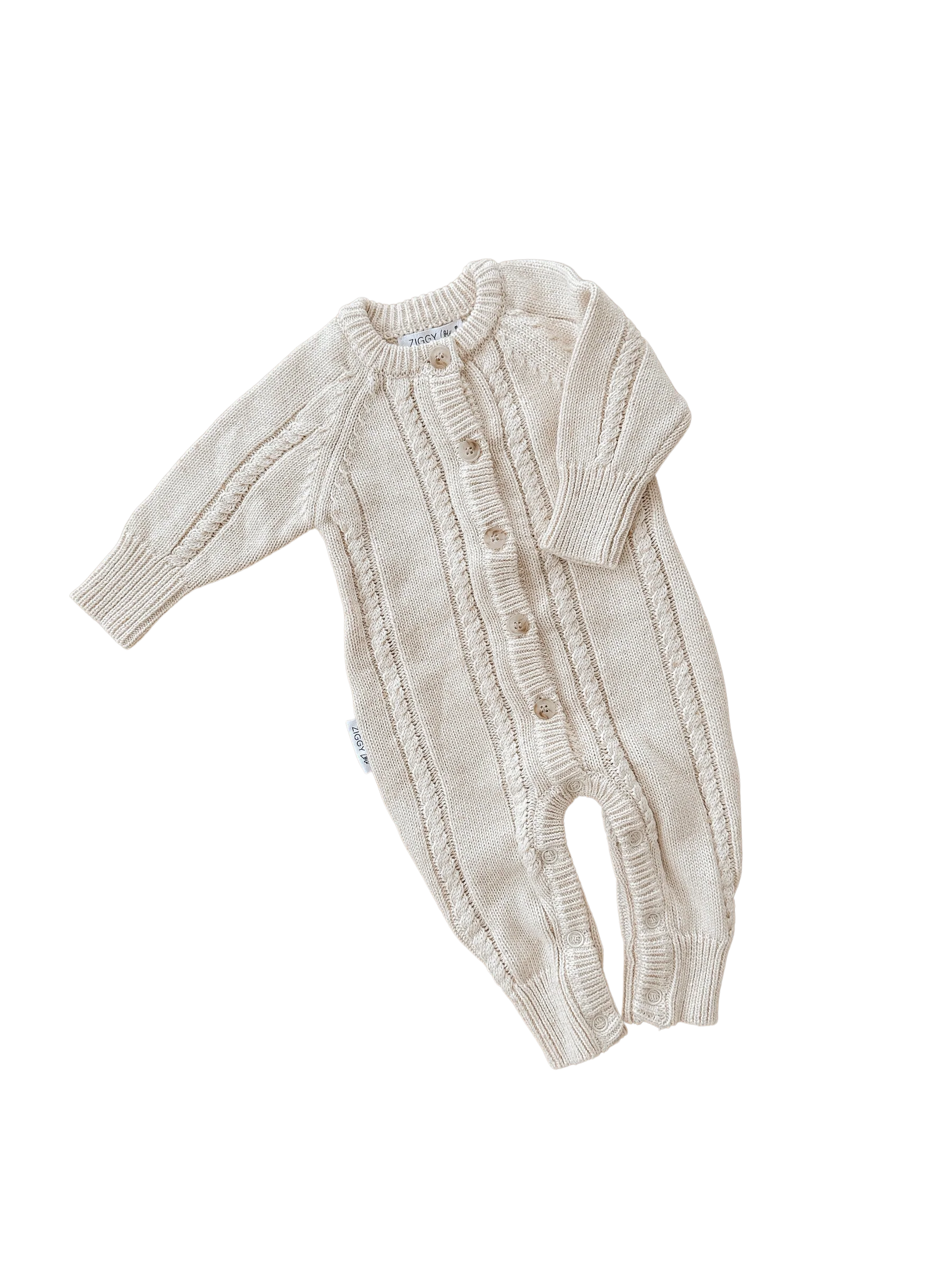 A beautiful knitted Biscotti Fleck romper, with gorgeous braid detail is designed with comfort in mind. Designed to be a timeless keepsake to remember just how teeny, tiny they were. A high quality piece to pass down to other siblings or a special something to pop in their keepsake box. Functional snaps at crotch for easy nappy changes. Pair with our Biscotti Fleck Beanies + Booties for the perfect winter outfit.
