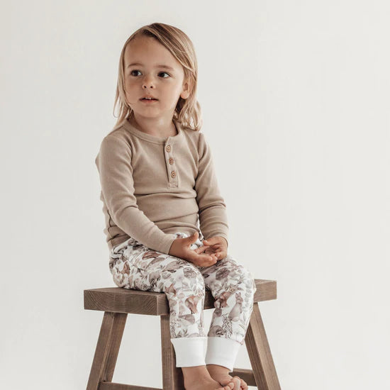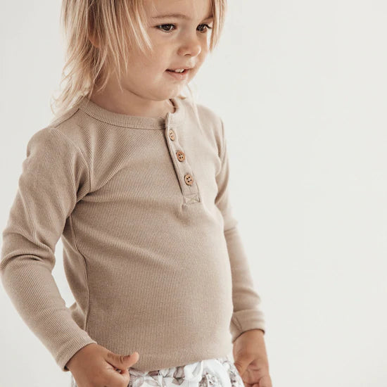 Our hazelnut rib henley top has been designed with comfort in mind and is made from the softest organic cotton rib. They feature our signature natural coconut buttons along the chest and mix and match perfectly with any of our other garments for a cosy winter outfit!