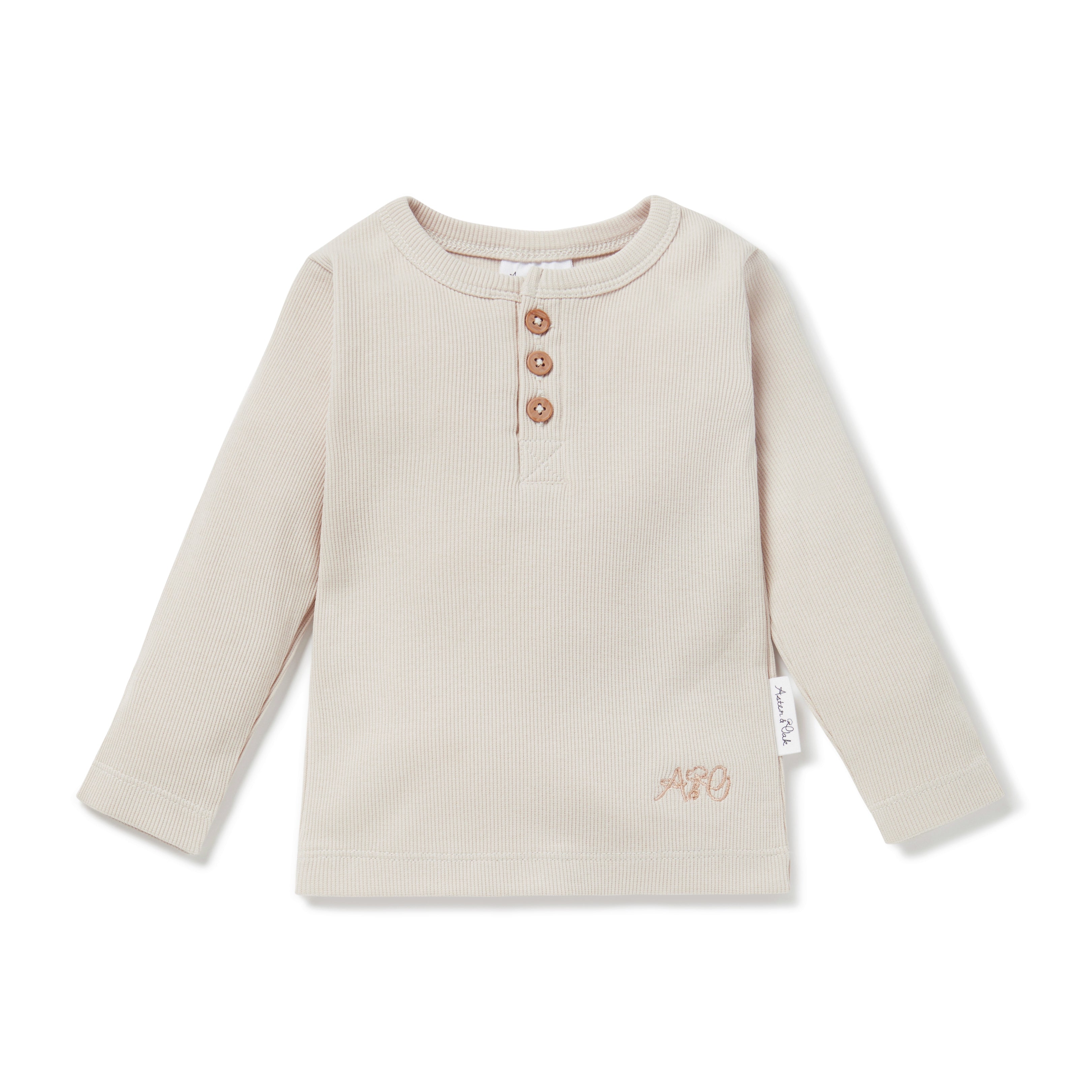 Made with GOTS certified organic cotton, this oatmeal long sleeve ribbed top features a henley neckline, our signature coconut buttons and is an easy to wear stretch rib. 97% Organic Cotton / 3% Lycra.