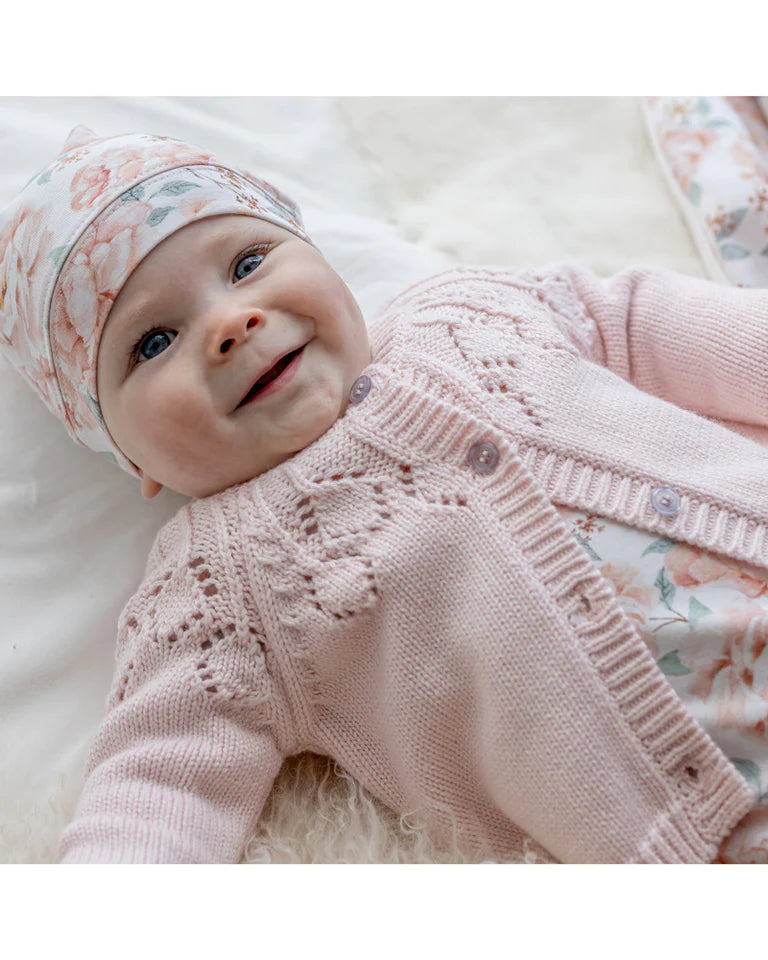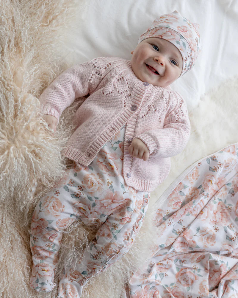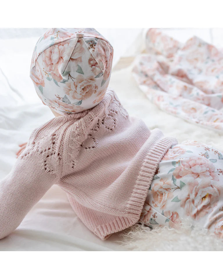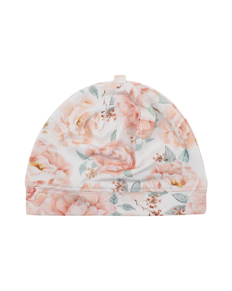This gorgeous rose print beanie with band is perfect for keeping your little one cosy and warm in winter. Perfect little outfit matched back with the Coco wrap onesie or the Coco zip onesie.