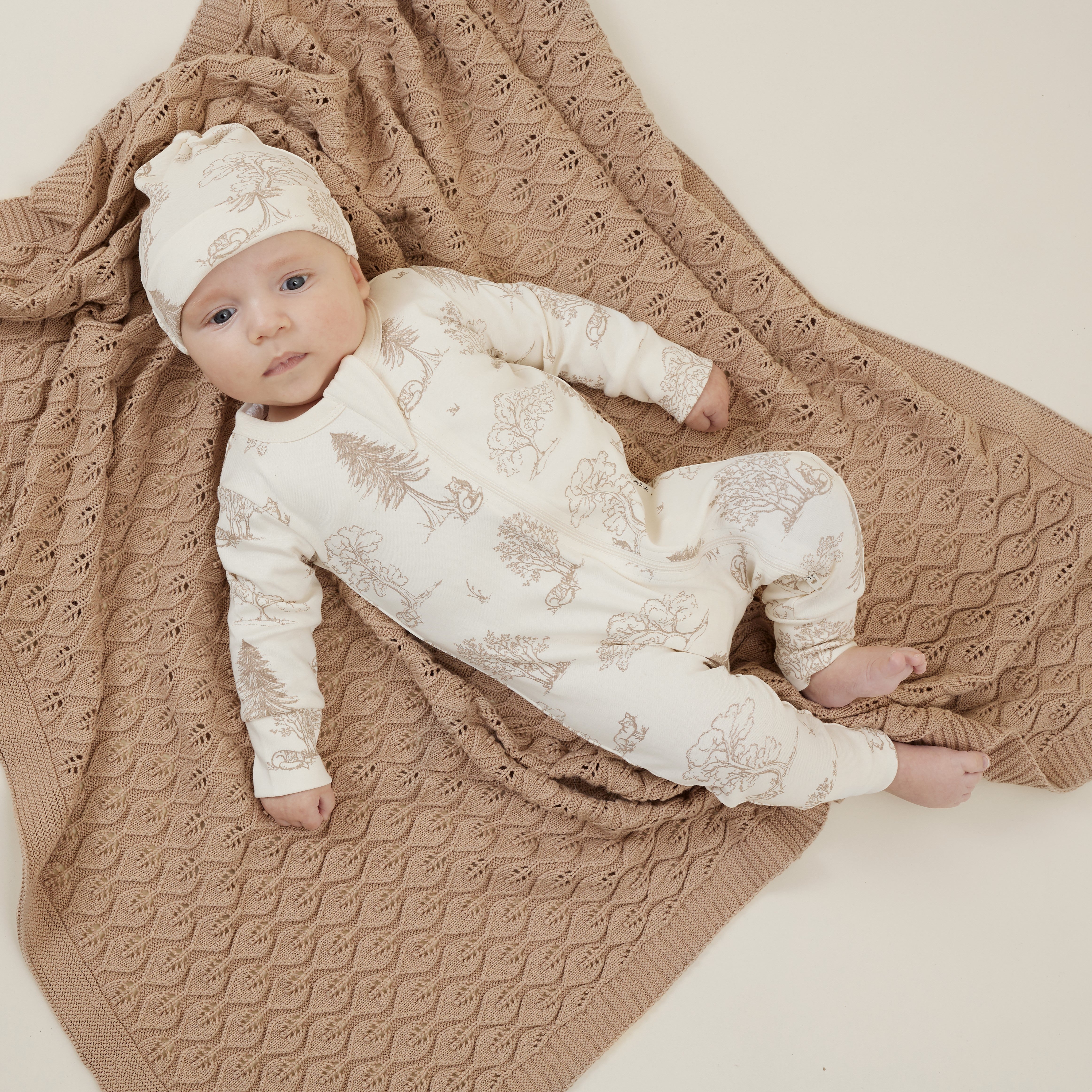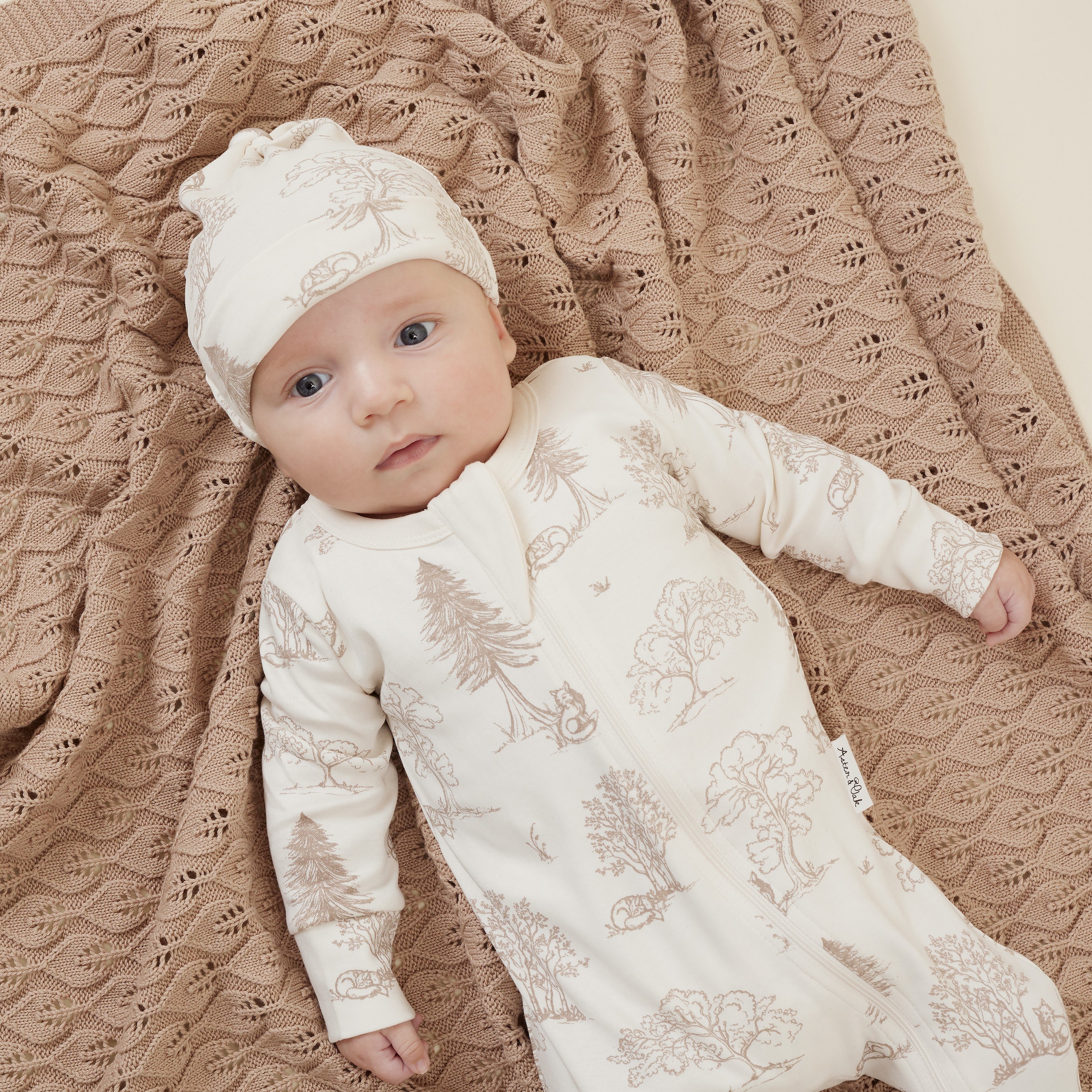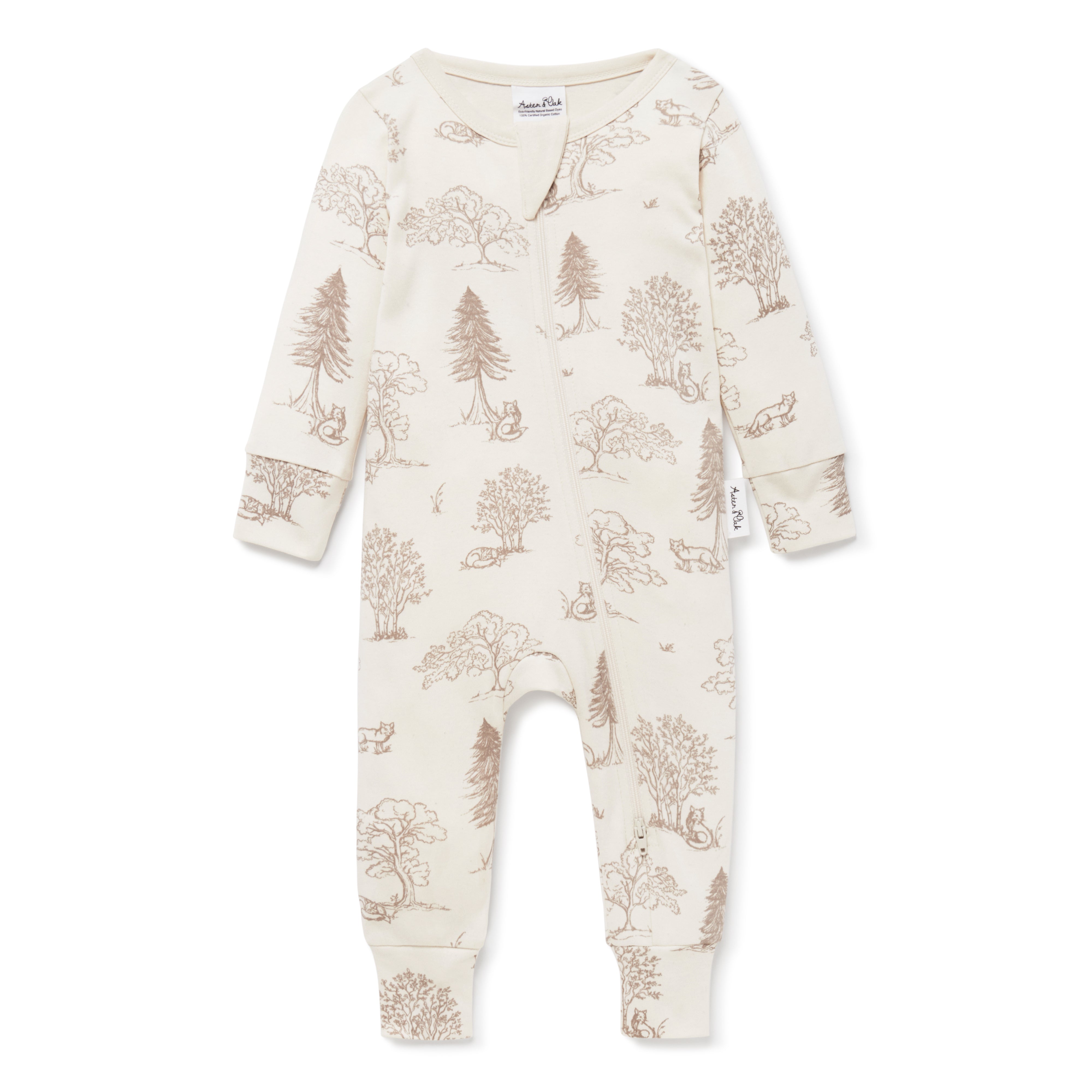 Made with 100% GOTS certified organic cotton, this hand-illustrated long sleeve fox woods zip romper features two-way zip with a protective zip cover.