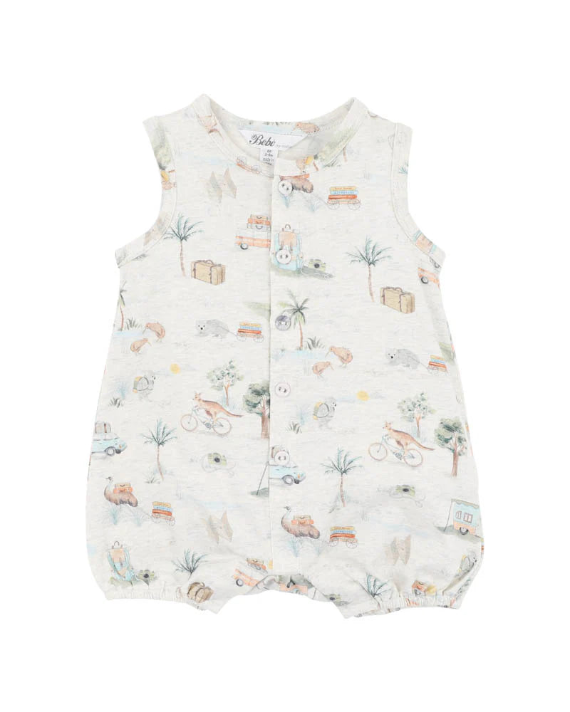 A warm-weather favourite for adventurous little explorers, this sleeveless romper is all about easy comfort and playful charm. Featuring a whimsical all-over print of Aussie animals on holiday, it's perfect for sunny days and laid-back lounging.
