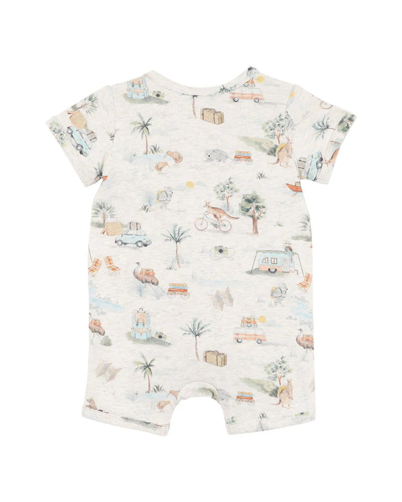 Pack the adventure into every day with our Australian-themed romper, scattered with adorable native animals and camping moments. Crafted in a soft cotton elastane blend for comfort and stretch, this short sleeve style is perfect for warm weather exploring. The easy front zip opening with safety fold at the neckline ensures quick changes, while the all-over print adds a playful Aussie spirit to your little one's wardrobe.